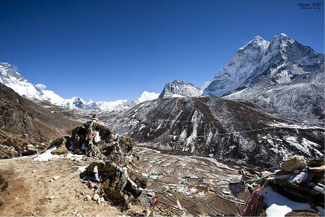 在Dingboche的最后一天,我们爬到了村后一座海拔5100米不到的小山包,就当是EBC前的一次小热身。只是一夜,雪基本已经融化,天气好的一丝云都没有(其实这样的天气拍出来的片子反而不好,太单调)