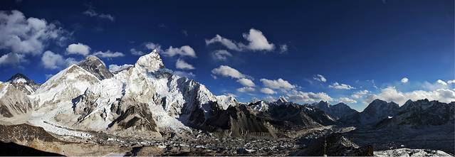 站在Kala Patthar之上,对面就是喜马拉雅山脉,中间黑色的山峰就是珠峰,右前方如尖矛般直指云间的山峰是海拔7800多米的努子峰