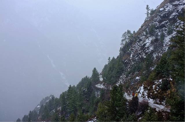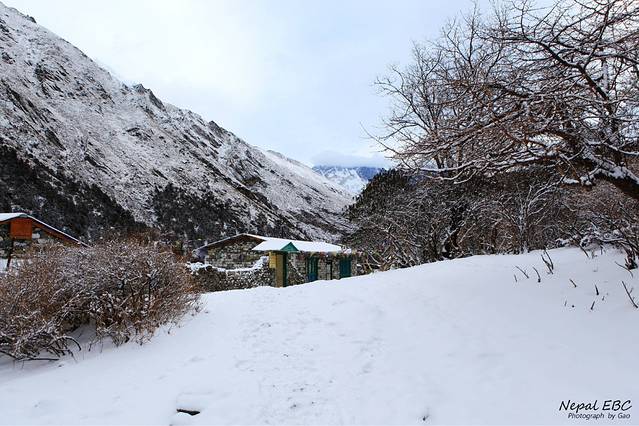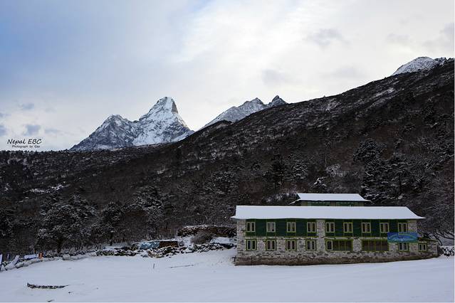 入住的客栈,因为下雪,向导告诉我们在Tengboche晚上会比较冷而且第二天早上雪路可能会结冰,先下行十分钟左右到达平地,相对安全一些。