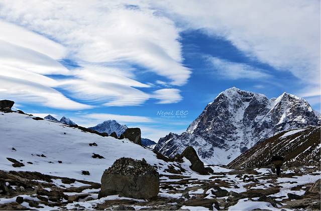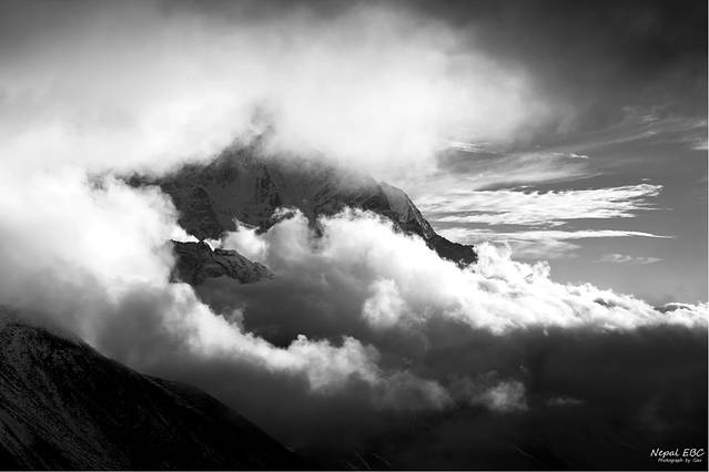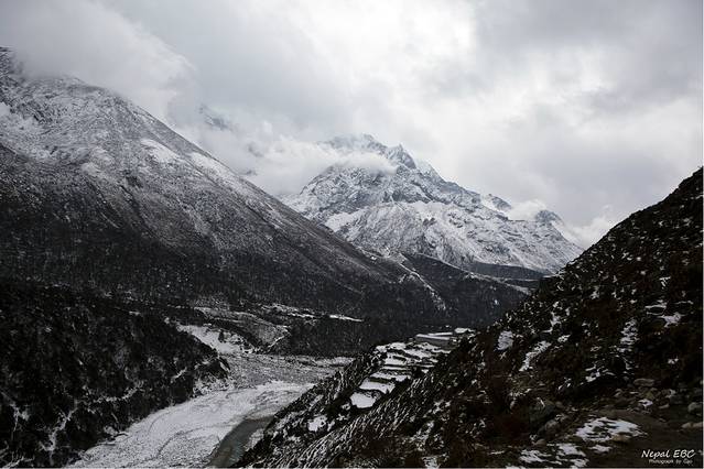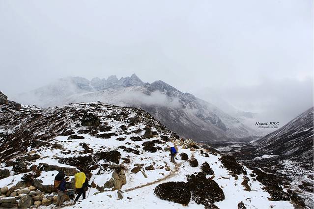 天空只是短暂的放晴,太阳又马上躲进了阴云中再不肯露出一角,万事开头难~~~以往的经验告诉我,在冬季的山里,这样的天气不会持续数日,一般都是三两天阴云,三四天晴天。当我们到达EBC的时候,幸运指数到达极致,两天风和日丽,晴空万里,萨迦玛塔的问候来的正是时候~