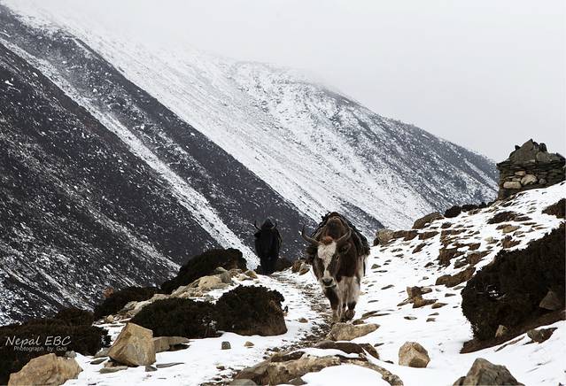 一个带向导证的夏尔巴主动找到我们,谈好价格(800尼比一天,消费单算),我们一行三人要求三个背夫,之前的经验告诉我,要对背夫给予足够的尊重,他们也是人不是驮马,不要认为他们有无穷的力量可以一个人被几个人的物品,这样的结果往往是他们中途要求加价或是罢工。没想到,带证的背夫还是不靠谱,他先答应我们另两个人已经找好,带我们去他家,之后竟然要让他的两个十岁左右的女儿背着我们的大包走EBC,面对这个突如其来的情况我们都有些不知所措,没想到他竟然可以忍心让他年幼的孩子负重走十几天。果断地回绝了他的要求,甚至做好了在卢卡拉耽误一天找好背夫再出发的准备。他看到我们态度很坚决,又把他妹妹请出来,说肯定没问题(她妹妹身材高大,很结实的样子),剩下一个背夫他说到Monjo去找,既然已经到他家,虽然有些不满,但碍于时间已经下午2点,他家又离卢卡拉半个小时的路程,我们决定相信他,2个大包给他们,我背一个。没想到走了不到一个小时,他妹妹已经走不动了,又找了另一个人帮忙。。。之后又是一通花言巧语,告诉我们今天不到Monjo,在Phakding帮我们找好向导,一定没有问题,我们还是相信了他,毕竟刚第一天,万事开头难,看看后面情况再说。第二天早上出发前,我们发现向导找的背夫竟然准备穿凉鞋上山,这是冬季,为了我们的安全和对他们负责,我们终于决定pass掉这个向导,请客栈老板帮我们重新找了三个背夫,事实证明,万事看头难,这年头有证的未必好使,没证的没准更好用~~新的三个背夫在后来的路上很负责,我们相处的非常友好,很开心~