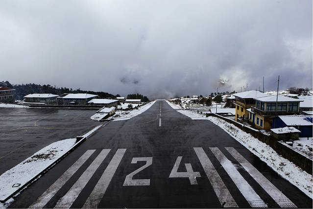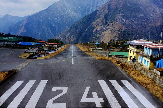 尼泊尔卢卡拉机场跑道坡为18.5度,呈起伏状,世界罕见,长度仅为475米。跑道尽头是千仞绝壁,一次失败只有机毁人亡,绝无复飞可能。跑道入口是宽度不足1000m的山谷,机场有大量的乱流,我们有幸被困三天。起降时提心吊胆,飞行中却异常平稳,此行唯一一跤拜机场冰路所赐,友人形容“飞起来拍地上..."