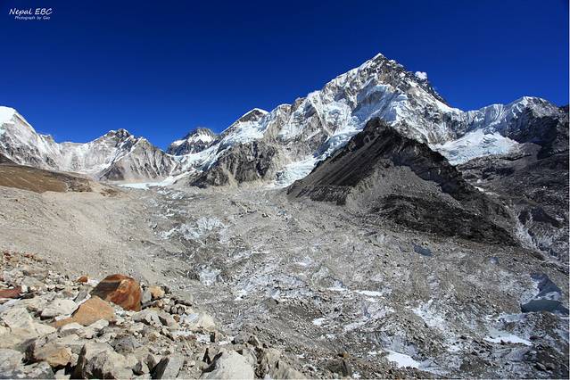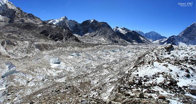 起初一直以为自己走在碎石路上,直到看到碎石下的冰层,才恍然大悟,原来不知不觉间我们已经走在了昆布冰川之上。
