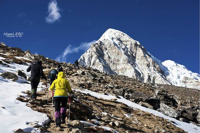 向Kala Patthar观景点缓慢蠕动~~~三角形的巨大山体就是海拔7161米的Pumori