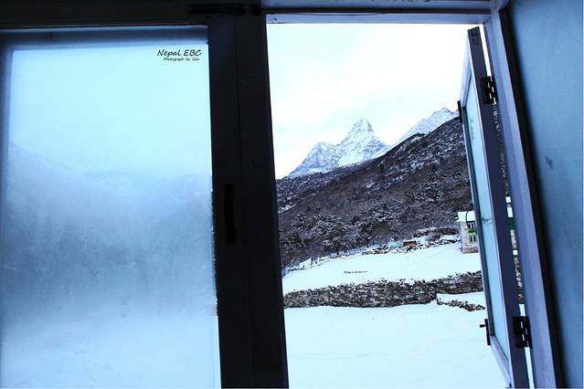 第二天早上,迷迷瞪瞪睡不着了,推窗第一眼,看到Ama Dablam,一座6812米高的雪山,放眼亚洲以外的其它地方,这个高度足以使其傲视6大洲,然而在亚洲,在萨加玛塔国家公园里,这个高度实在是算不得什么——珠峰、洛子、卓奥友、马卡鲁等几座八千米级的大哥大矗立在这里,还有像努子、Pumori等几座七千米级的兄弟们伴其左右。然而就是这座看似不起眼的Ama Dablam,却是当地人眼中的神山,也是一路上陪伴我们时间最长的雪山,不同的位置不同的角度不同的光线下,它所呈现出的色彩,姿态各不相同。“山不在高,有仙则灵”这句话用在Ama Dablam上恰如其分。