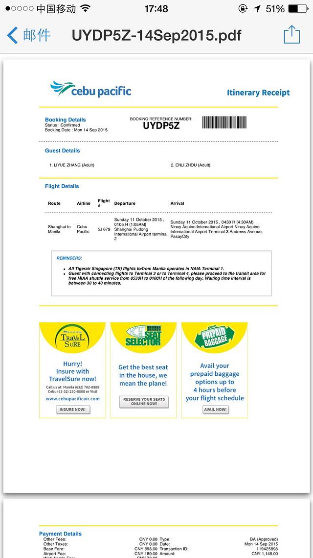 超全秘籍:还有重要的事写前面,现在在宿务订的机票,不用在离开的时候支付出境税了,我们后来留了2800P出境税,然后说不用,全带回国内了!
