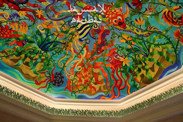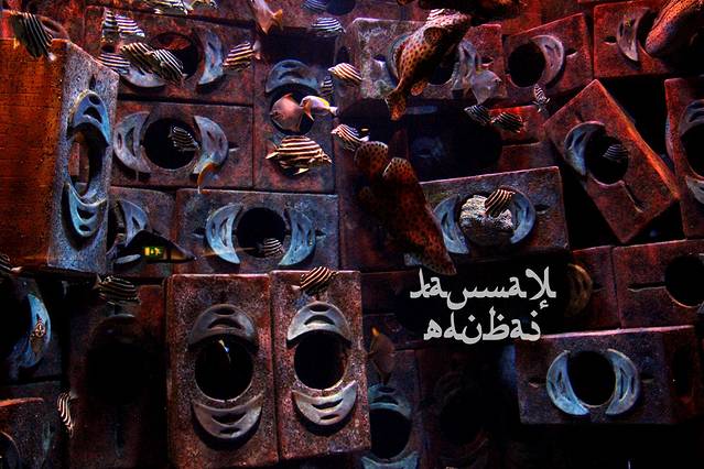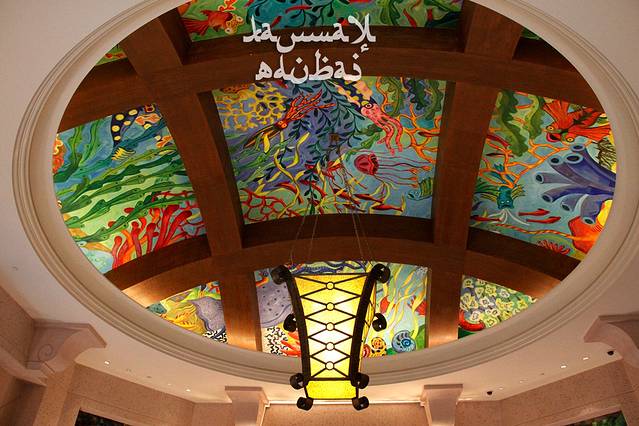 失落的海底世界,它有一个非常巨大的鱼缸,里面盛有1150万升水,有65000多条鱼。站在酒店的走廊上就能到“大鱼缸”里的鱼。整个大鱼缸有2层楼高,因为要承受非常大的水压,所以缸壁非常厚,最厚的地方有77厘米。当里面的鱼贴着鱼缸游时,即使在外面使劲拍打缸壁(当然我并不会这么做),那些鱼也是丝毫感觉不到,里面很多看起来很诡异的物件装饰着这个大鱼缸,倒是非常贴合这里的主题。