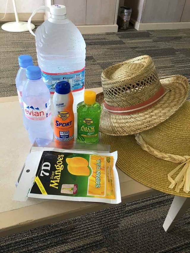 防晒用品:太阳镜、太阳帽、太阳伞、防晒衣、防晒霜(塞班购买香蕉船SP110和晒后修复)