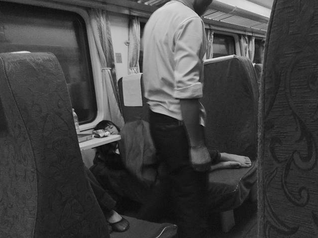 一张不合格的抓拍,夜已深,去学校报道的一家人,母女早已安睡,不知道从哪刮来的大风,父亲把自己带的外套披在了女儿身上,弄好了怕把孩子弄醒,还不放心的看了一眼,女儿睡得依然安详。终于在26号早上四点多到达铜陵,打个车到学校翻墙差点被保安逮到,全程结束,晴多于雨,乐多于苦。