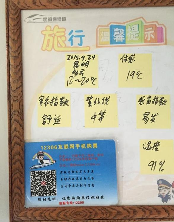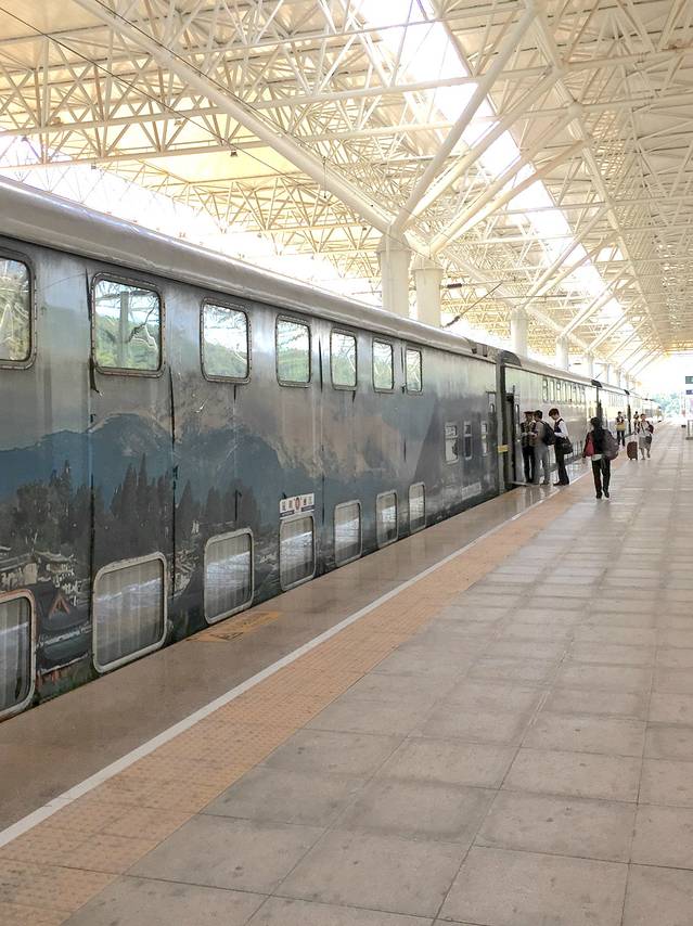 早上拼车去车站,丽江——昆明,民族文化品牌列车,真的好高大上啊,双层卧铺,只有车厢头是三层,其他都是上下两层,然后我就悲剧了,谁叫你那么早买票的