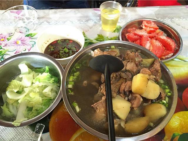 耗时两个多小时,四点左右终于找到了好人小吃,刚到门口老板就特别热情的打招呼,问我们有没有吃饭,然后就去宰鱼,让我们去充电,虽然地方很破,但是这些都不是问题。老板真是特实在,一大锅松茸炖鸡,真心吃不掉啊,现杀的湖鱼,因为没有任何调味品,稍微有点腥,我对鱼很挑剔,所以基本上是那个小伙伴吃的,她特别喜欢,还想去拜师呢,哈哈哈老板挺可爱的,一直在那自豪的说自己的菜好吃,就像个孩子一样。还说吃完拿苹果干吃,笑称不会这么轻易放过我们的。吃饱喝足,头都不痛了,吃了苹果干,味道真心不错,酸酸甜甜的,于是买了一袋为了应对明天的车程,可是后来吃着根本停不下来啊。