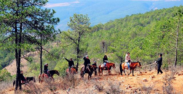 10:00 伴随马蹄声、马儿铃铛声骑马出发。骑行路线:由马场出发,途经最原始的茶马古道线路,纳西古村(至今保留纳西原生态气息的村落)--花果山(万亩果园)--茶马驿站(马帮休息、调整、喂马)--情人树(保存完整的纳西古树林)--雪山眺望台(可远观玉龙雪山)--猎鹰谷(原始的高原猎场)--望海坡(拉市海全景尽收眼底)--会所