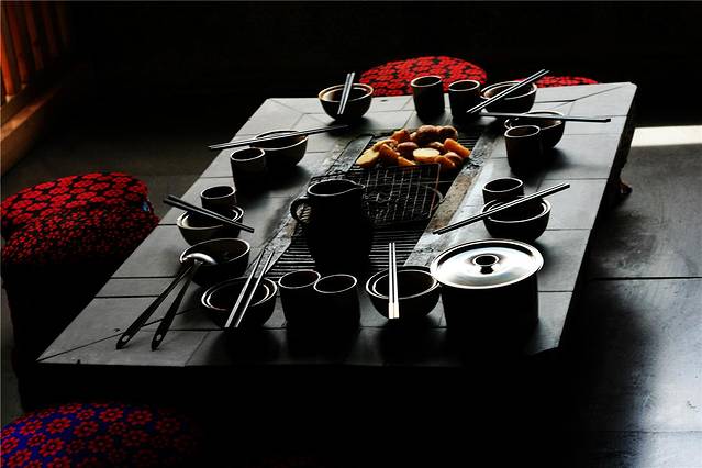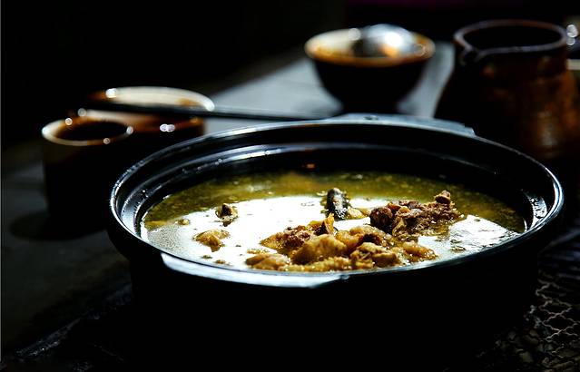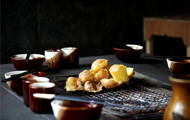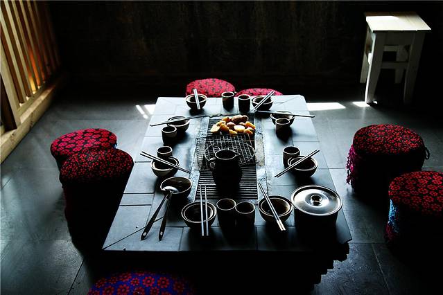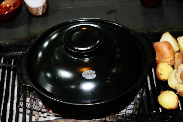 火塘土鸡火锅是丽江特色美食,砂锅放在炭火上,锅里肉美汤鲜,锅外围一圈土豆,也烤得热乎乎香喷喷的。