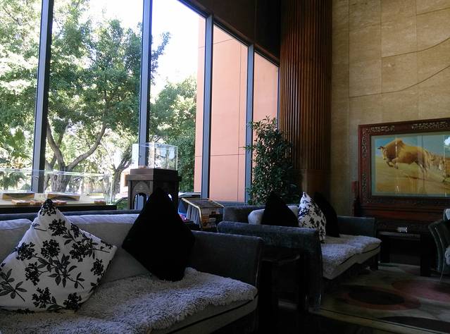 宾馆一楼大厅内供客人休息的沙发,这沙发的颜色和抱枕的颜色很和谐,看着心里面舒服,坐上去很舒心,坐着就不想起来了。