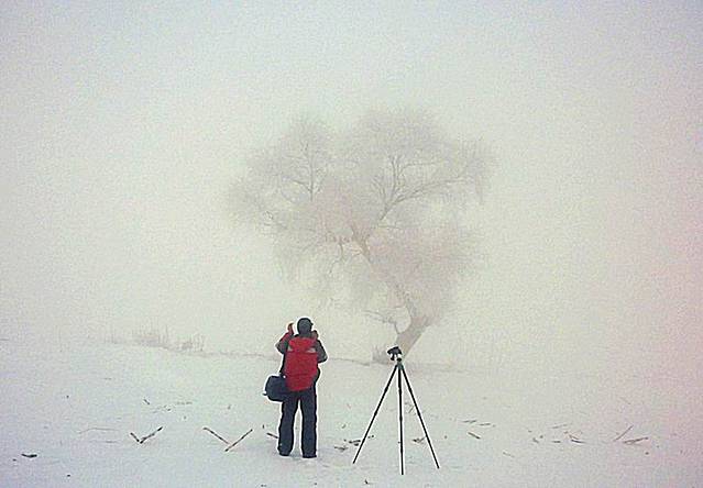 观赏吉林雾凇的最佳时间是每年冬至到正月十五。夜间的温度要在零下20度左右。雾凇形成要求昼夜温差大、无风或微风等条件,拍到好的雾凇并不容易。我们去的时间虽然晚了一点,但赶上了难得一遇的夜寒昼暖并且无风的小气候,因此幸运地见到了非常精彩的雾凇景象。