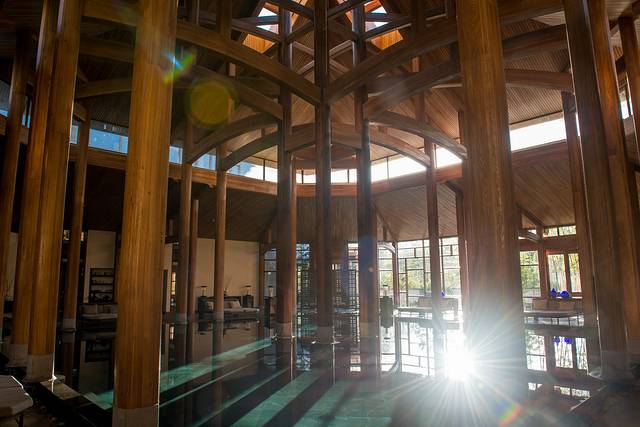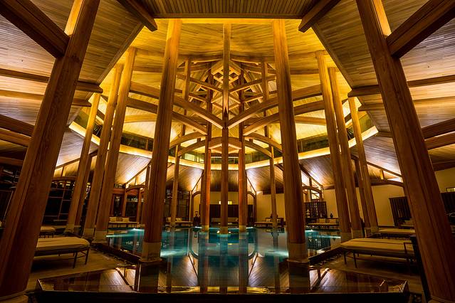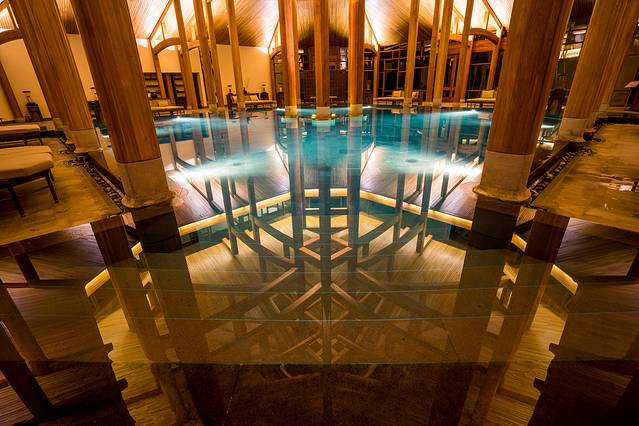 室内泳池无疑是绝对的亮点。同样气势恢宏的大厅,完全被泳池占据地面。 水面波纹不兴,倒映着柚木复杂而精巧构架的弧形穹顶,如苍穹深邃高远。静卧池边,仿佛上下两个穹顶构成了完整的球形,仿佛是对宇宙空间和时间的崇拜,有一种不忍下水的感觉。要是有满天繁星该多好啊!