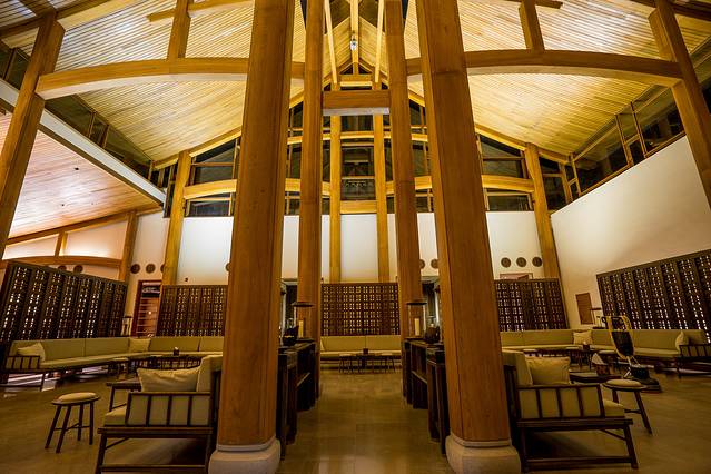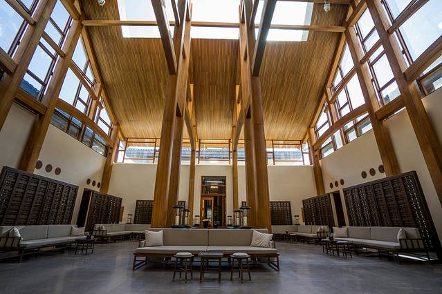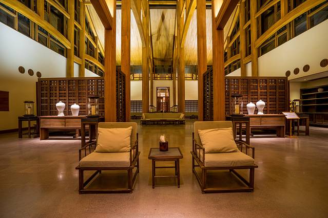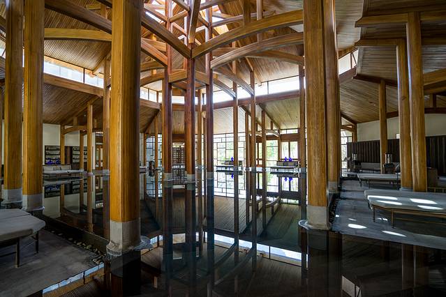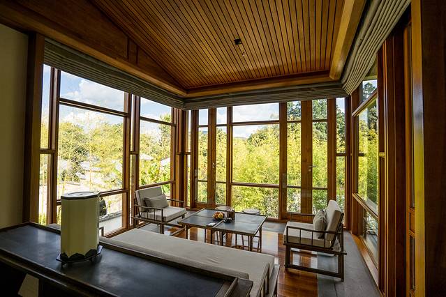 步入大厅,全柚木的房屋构架,仿佛有丝丝木香飘来。让人惊叹的是高达七八米的大厅。挺拔而立的原木纹立柱撑起木制屋顶。硕大的天窗让大厅光线充足,白天完全不用室内照明。更为惊奇的是整个房屋建筑不用一颗现在的金属钉隼,采用云南传统木结构建筑的梁架结构和隼接方式,构建成一个统一的整体。仅靠自身重力将整个木结构放置于坚固的石基之上。无愧为云南建筑艺术的现代化典范。恍惚间让人有种仿佛进入了博物馆的感觉。