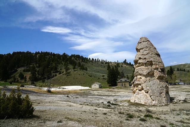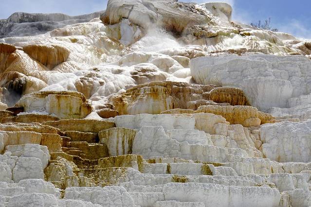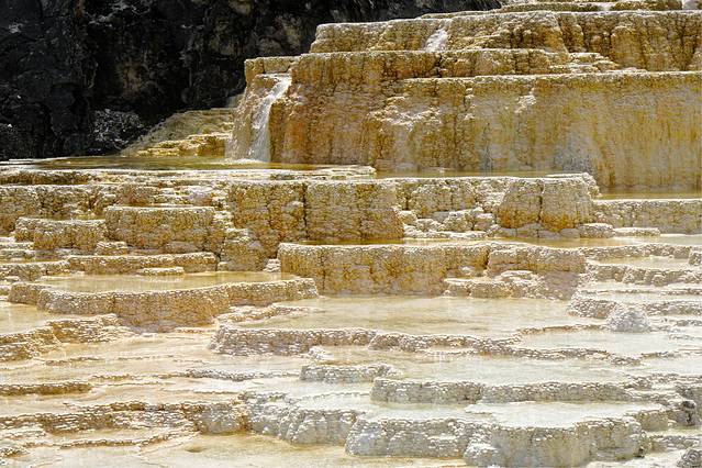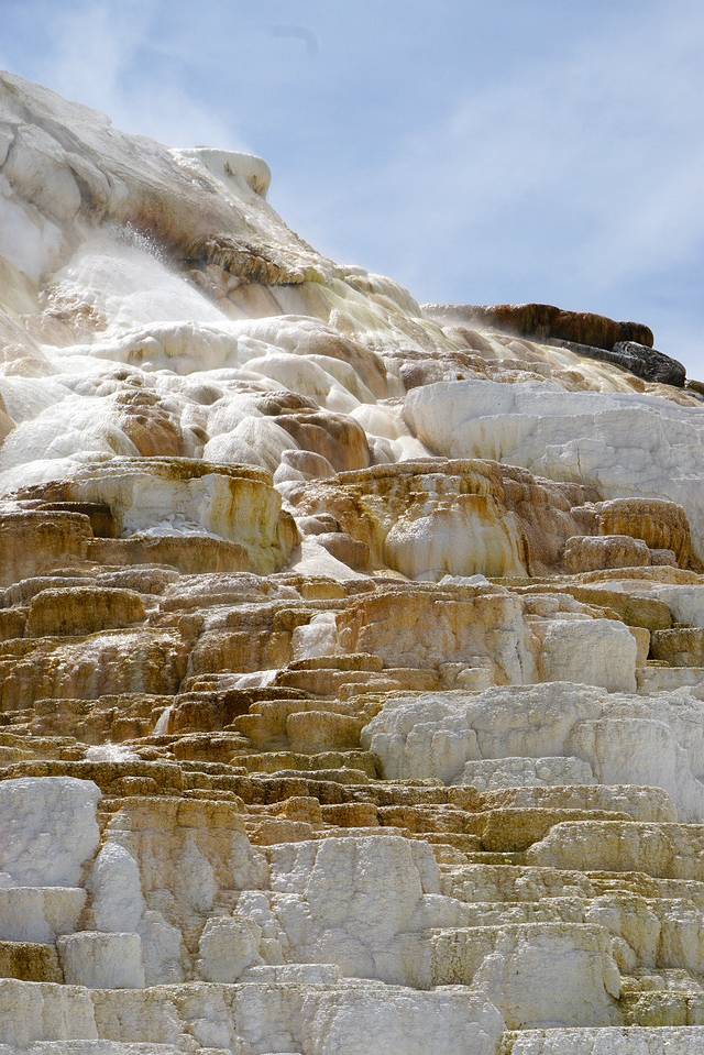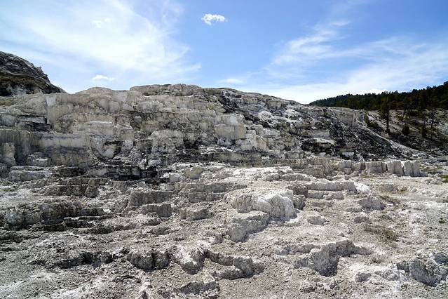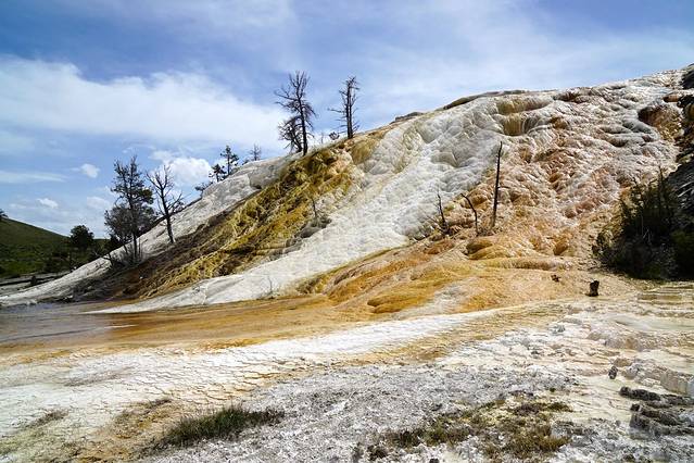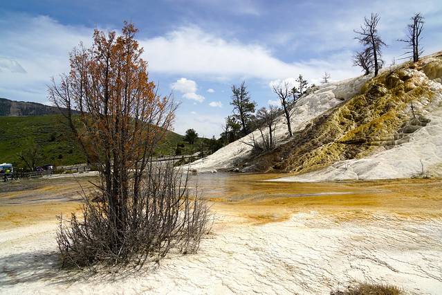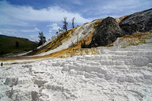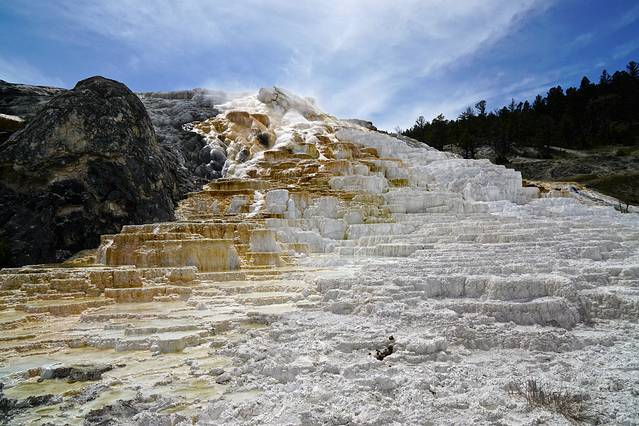 Mammoth Hot Springs(猛犸象热泉区)是世界上已探明的最大的碳酸盐沉积温泉,也是我非常喜欢的一个区域,那些石灰石台阶太漂亮了!可惜的是,2002年的一次地壳运动,使得大部分的热泉停止了活动,微生物大量死亡,死掉的细菌变成了灰白色的粉末,残留在干枯的台阶之上,与生机勃勃的白色台阶形成鲜明的反差。回想一下我们曾经去过、没去过的那些已经消失了的景观,不禁感慨,一切都要趁早啊,不知道什么时候就再也看不到了。