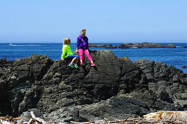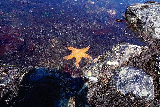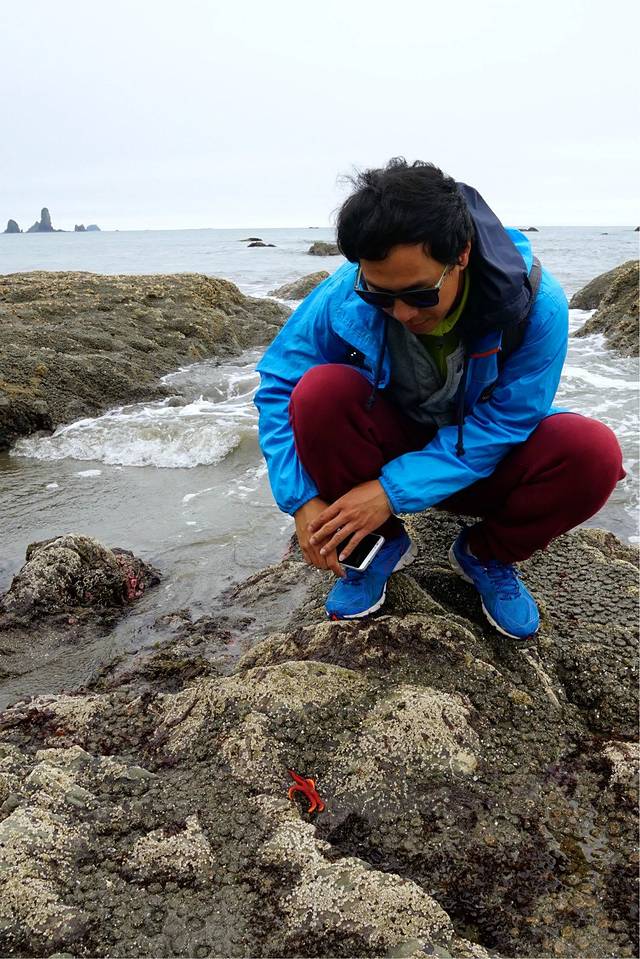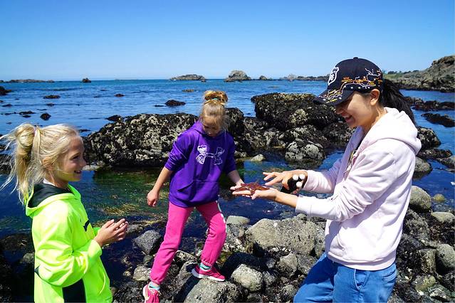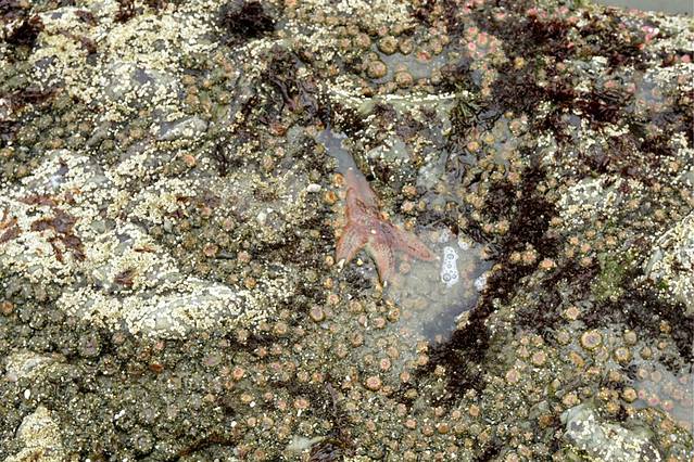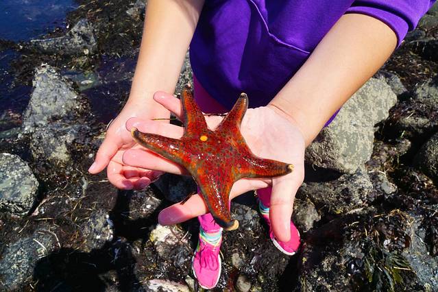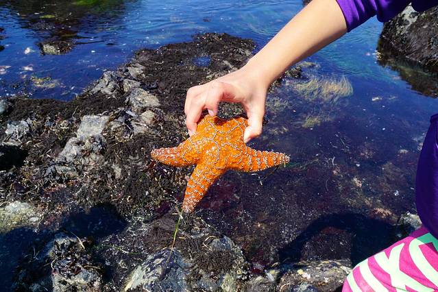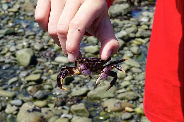 我们一到那里,我的视线就被两个坐在大礁石上的小姑娘吸引了,两个小姑娘很漂亮很纯真,坐在大礁石上说着话,与周围的大海构成一幅美丽的画面。我们踩着刚露出水面的石头,小心翼翼的往小岛方向去,这时一对夫妇冲着我们说了一堆英文,我们茫然的看着他们。然后,女的又说了一遍,大概是说他们在这里发现了什么,但那个什么的单词我不懂,于是重复着她说的这个单词,打着问号。男的看到我们还是没有明白,干脆用行动告诉我们,他让我们走到他跟前,然后掀开脚下的石头,好几只小螃蟹跑了出来,原来他们是在说这里有很多小螃蟹。他们的儿子此时也来到了我们跟前,向我们展示他手里一只比较大的螃蟹。那位妈妈看到我们很感兴趣就告诉我们还有很多海星,她打开相机让我们看她拍的照片,非常漂亮的海星。我激动的问她在什么位置,也想去看海星。她告诉我们可以叫她女儿带我们去找,刚才就是她们发现的,于是她对着刚才我注意到的礁石上的那两个小姑娘喊了一声,问她们是否愿意带我们再去找一次海星。她们跑过来欣然的接受了这个任务,带着我们去潮汐池里找海星。每找到一个海星,她们都会跟我们讲解是什么品种、什么特性,还让我触摸它们,体会它们身体的不同。真是太开心了,两个我喜爱的小姑娘带着我们去潮汐池找海星;真是太幸运了,遇到了潮汐池退潮,还有一家人带着我们去发现海星和螃蟹。他们一家人走后,我们俩又在这里玩了一会儿,乐哥也像刚才那个爸爸做的那样,翻开石头找下面的小螃蟹,这些小螃蟹很乖巧,就算把它们放在手上也不会用钳子袭击人,也许是它们感应到了我们并不会去伤害它们,只是想和它们玩一会儿。