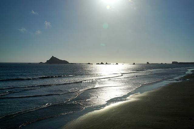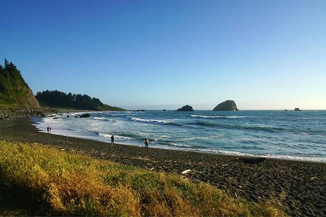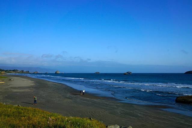 再次回到海边,大海已经被阳光笼罩,碧蓝的海水、翻滚的白浪、星星点点的礁石、岸边金黄的枯草与蓝天白云合唱着美丽的交响曲,如此令人迷醉,今天不走了,就住在这里了——美丽的海边小镇Crescent City(克雷森特城)。