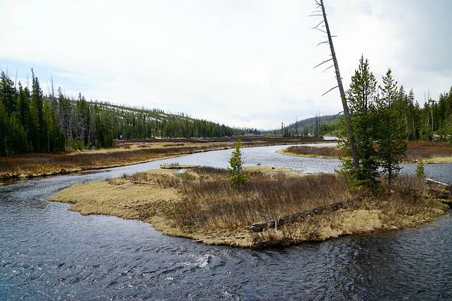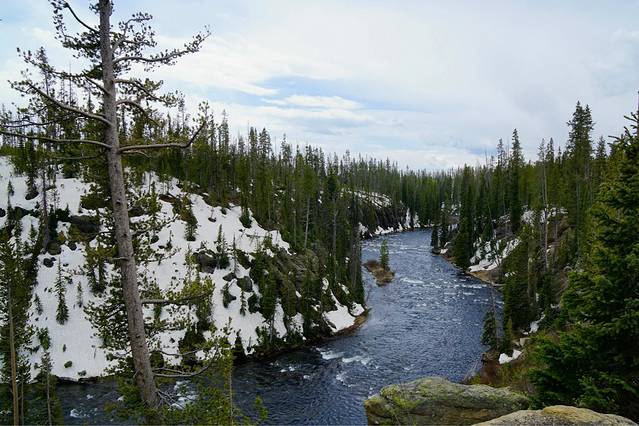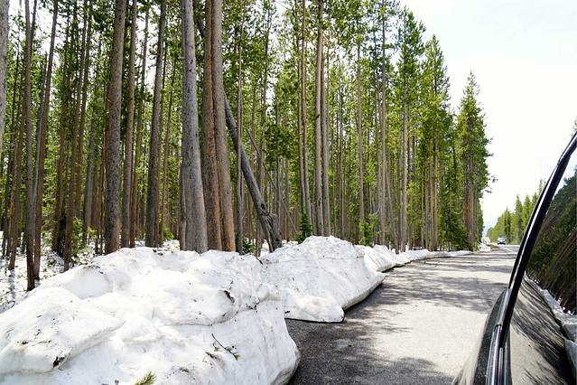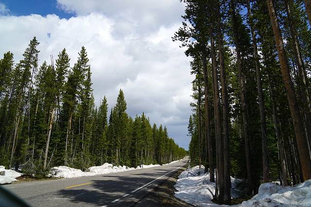 离开大提顿国家公园,沿着191公路开十多公里就来到了黄石国家公园的入口。黄石国家公园的游览路线是个“8”的形状,我们原打算今天进入公园后往西去,先游左边的8,这半边靠近晚上住宿的West Yellowstone(西黄石)小镇;明天再游览右半个8,回Jackson住。可是,开到路口竟然发现封路了,事实上是没有开放这段路。美国的国家公园很多区域冬天的时候是关闭的,到了5月份才陆续开放,决定来黄石之前,我们特意查了公园开放的情况,看到4个门都开了,关键是我们从大提顿过来的南门已经开放了(5月8日开放),就放心大胆的来了。想不到,门口开放并不意味着所有的道路都会开放,从南门到西门的路段还没有开放。