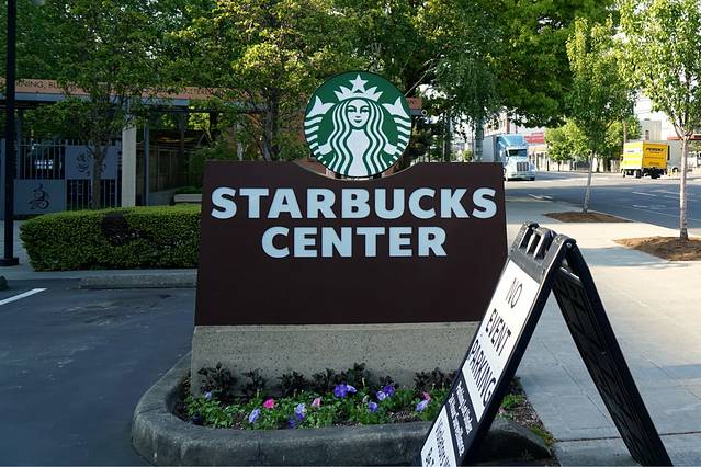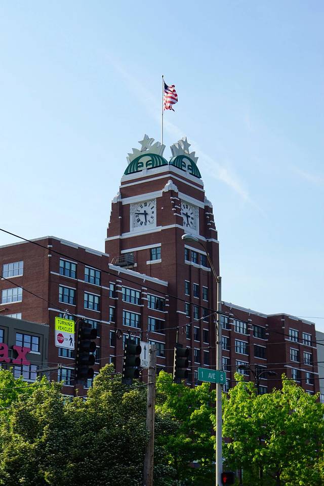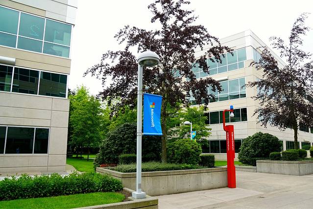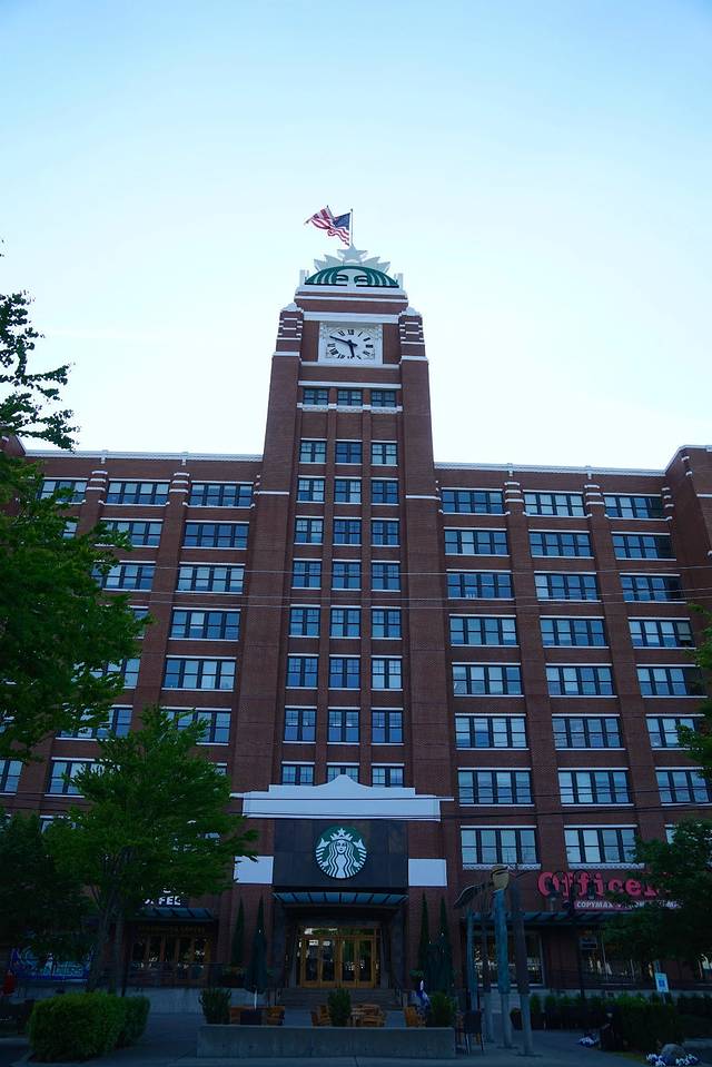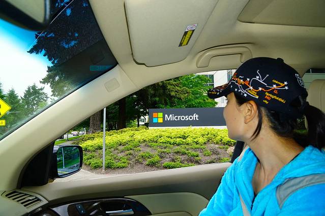 后来去的微软总部和星巴克总部情况大致相同。微软总部面积很大,覆盖了好几个街区,但是并没有围墙圈出来,一不小心就进入了微软公司。我们兜了好几条街都没看到所谓的“正门”,只是在路边有几个路牌一样的标志显示着这里是微软的地界。有一些车在路上开,行人不多见,到处都很安静。星巴克总部是我们偶尔遇到的,在路上开着车看到楼顶那个熟悉的小人儿,我们就转过去看看是不是星巴克公司。找了半天没看到围墙和大门,只是在一个停车场入口有一个标志牌,楼下大大的停车场都是员工停车位,没有门卫、没有保安。