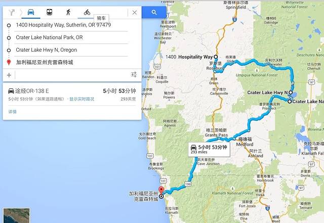 Sutherlin 萨瑟林酒店出发 →Crater Lake National Park(火山湖公园) →Crescent City 克雷森特城酒店入住(500公里)