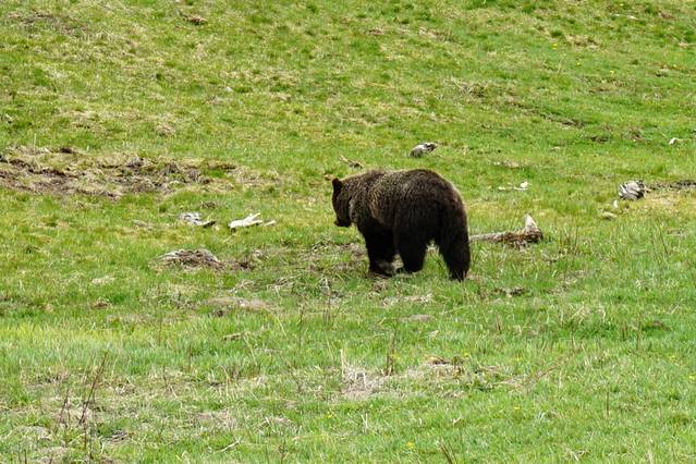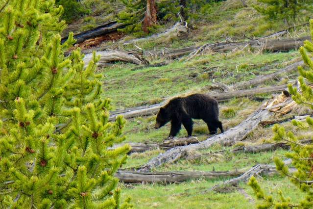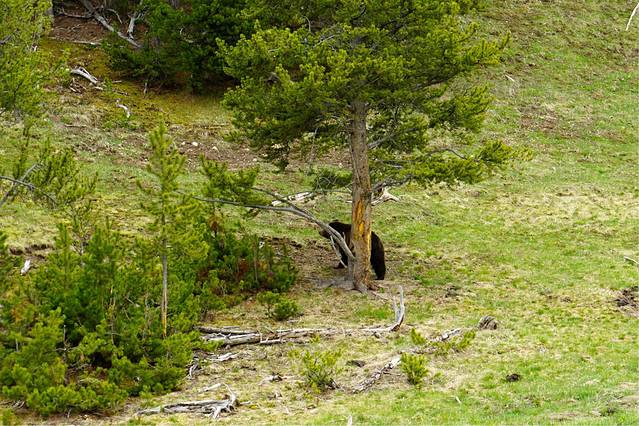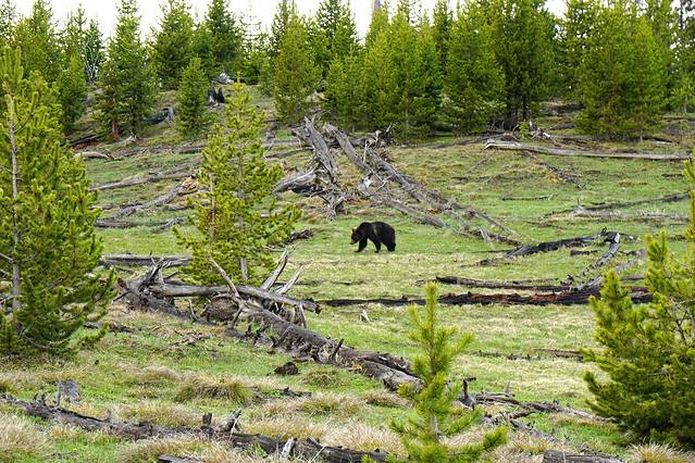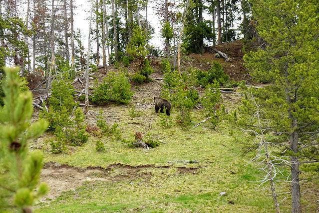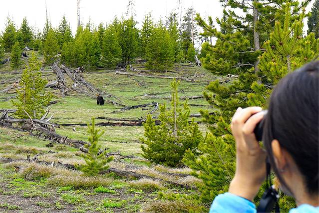 从那条走不通的路退回来,我们往Yellowstone Lake方向开去,刚转了个弯,就看到路边停着几辆车,凭直觉预感有熊。我们赶紧把车停在路边安全的地方,哇塞,一只黑熊距离我们只有几十米啊!我打开车门拿望远镜观望,做好随时逃进车的准备,并不是害怕熊会无端端的跑来伤人,只是担心这么多游客,万一有人做了什么不当的举动会惊扰熊。因为,前几天爆出了一个视频,就是在黄石有一只母熊带着小熊追赶游客。我分析了一下那个新闻的视频,本来熊在路上淡定的走着,游人小心的在拍熊,后来画面外有一个人大声叫喊“Run!Run!”立刻,一种紧张的气氛弥漫开来,有人开始奔跑,熊就开始漫无目的地追逐游人了。我在望远镜看到这只熊很专心的在草地上翻检东西吃,吃的很起劲儿,完全无视周围这么多的人的观望,我想它根本懒得来理我们这些人,除非有人烦着它了。