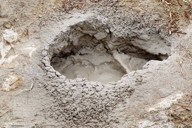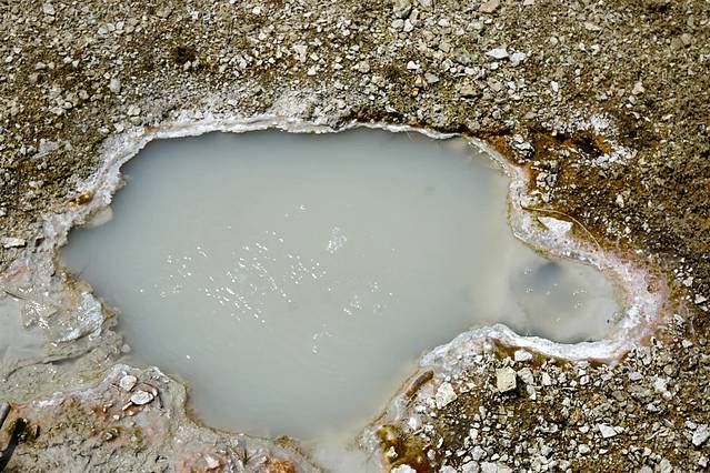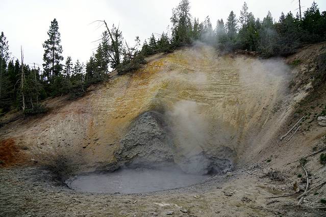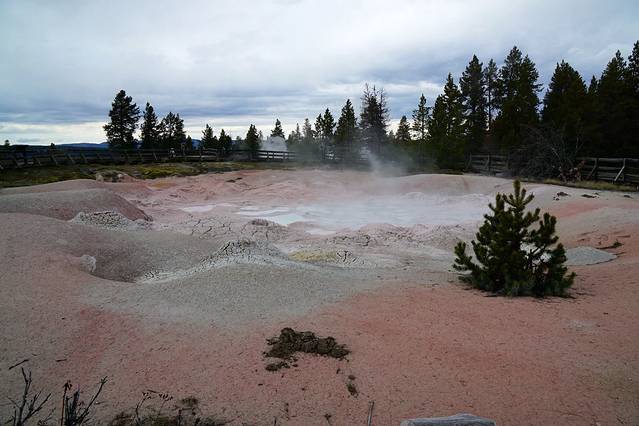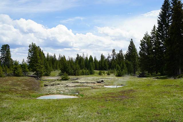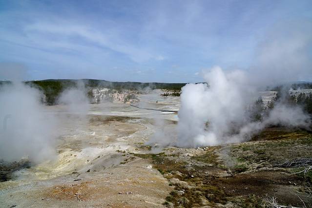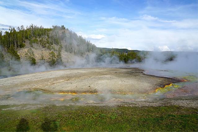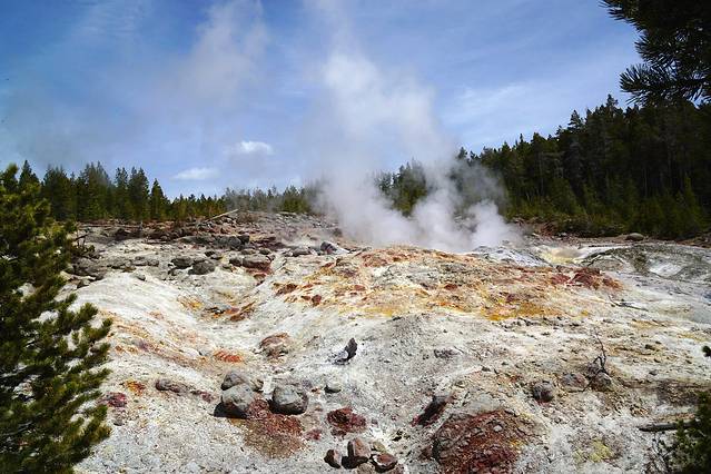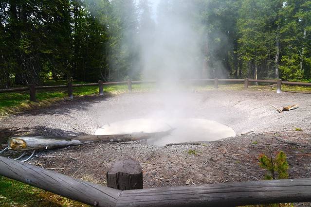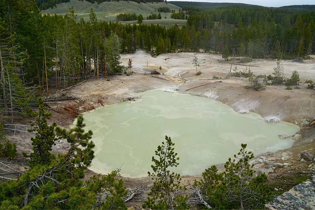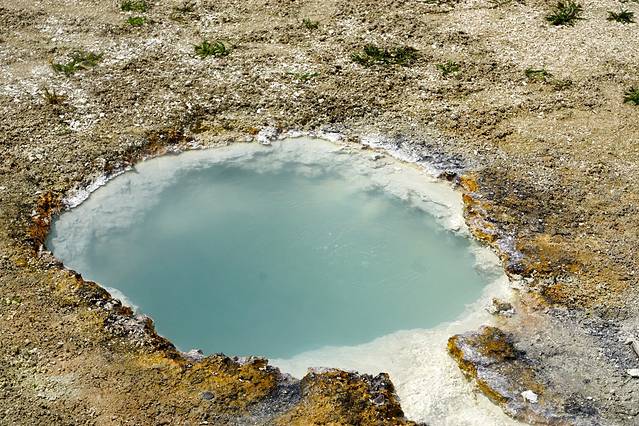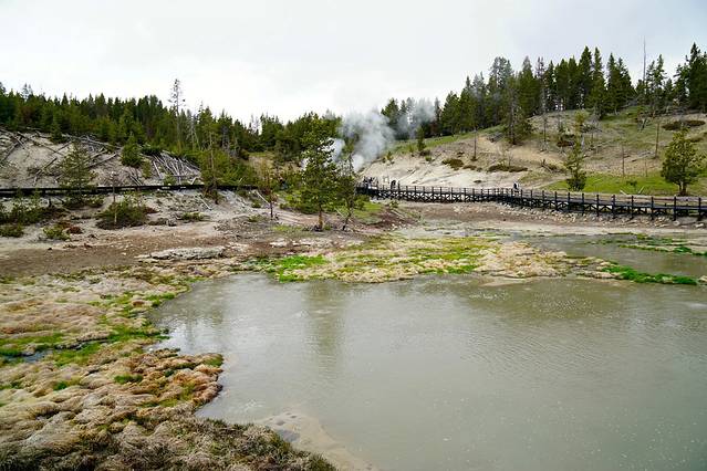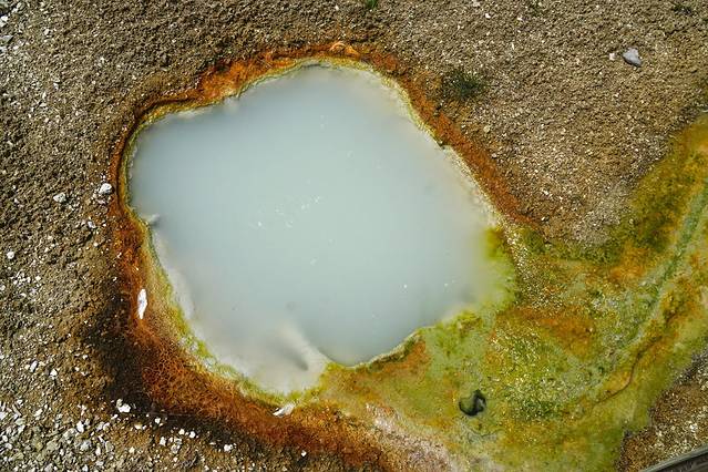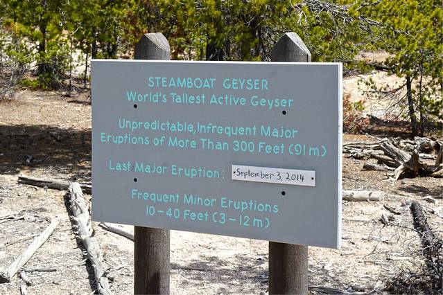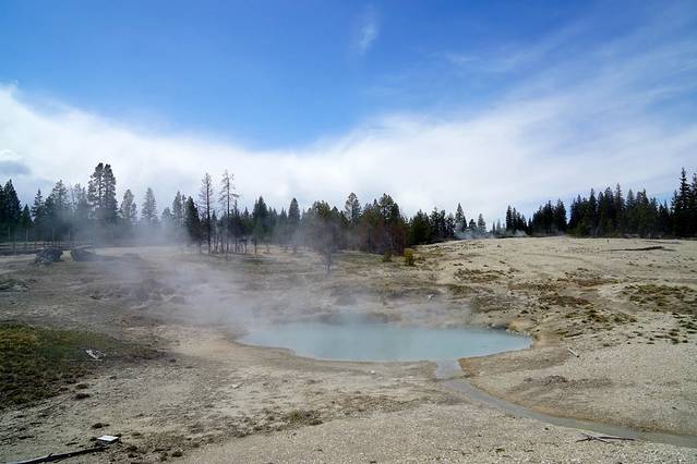 Norris Geyser Basin(诺里斯间歇泉盆地)在8的上下两个圈的交界处,昨天过来的时候没有找到,今天再走发现那个路口其实是个四岔路口,一条小的路口是去Norris的。这里的热泉颜色好漂亮,竟然还在一个热泉看到了彩虹。世界上最大的间歇泉Steamboat Geyser也在这个区域,这个间歇泉是隔好多年才会喷发一次的,喷发高度近百米。在网上看到的介绍说,最近的一次喷发是在2008年,来到跟前,看到这个数据已经更新了,最近的一次喷发是在2014年9月。这个间歇泉不喷发的时候只是冒着一些白烟,没有什么特别的地方,也许每个人来这里都期待着偶遇它的大爆发吧。