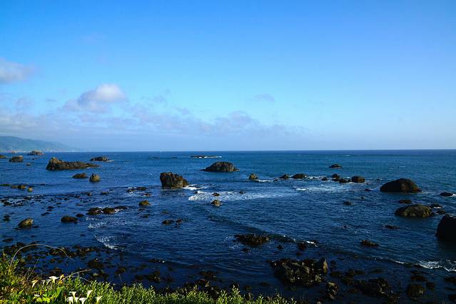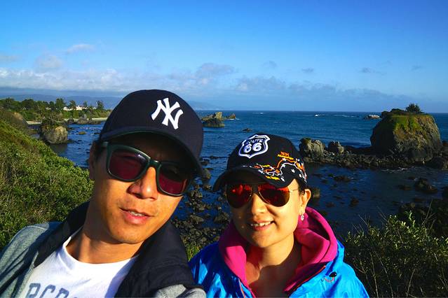 黄昏时分我们来到了Klamath Overlook,说起来还有点小插曲。因为我们今天睡了懒觉,游览的进度又比较缓慢,所以逛完森林已经差不多5点了,看这个形式今晚还得住Crescent City。Klamath Overlook在Crescent City以南20多英里的地方,虽然在明天的游览路线上,但今天还有时间,就打算先去了,明天可以多些时间玩多几个点。去的路上,我开始用手机找酒店,这一看吓了一跳,Crescent City百分之九十以上的酒店都订完了!因为5月的最后一个星期一是美国的“阵亡将士纪念日”,连上了周末就是一个三天的“小长假”,今天是假期的第一天,所以酒店爆满。我们一看这阵势,去完Klamath Overlook回来怕要露宿街头了,还是首先解决今晚的住宿要紧啊!我们马上掉头回去Crescent City,沿路问了一家看起来很不起眼的Motel,居然是满房。紧接着就来到了我们昨天住的那家酒店,一问还有,而且比我们昨天网上预订还要便宜,我跟前台说我要这间房,然后跑去车上拿护照和钱包,回到大堂听到前台正在接电话,说很抱歉最后一间房刚被订完了。我的天哪!真是好险啊!昨天还在嫌弃人家酒店看不到海还那么贵,今天就像捡到宝一样,哈哈。