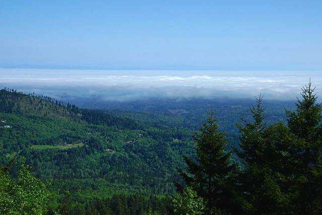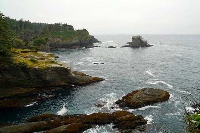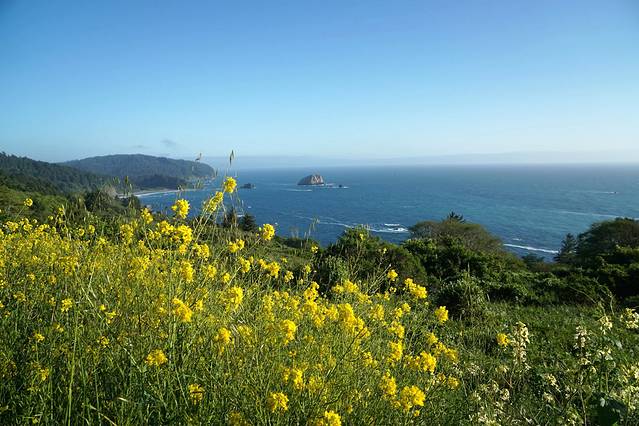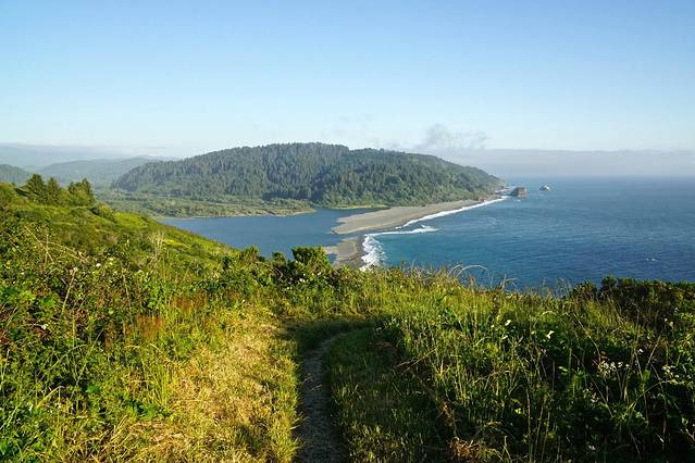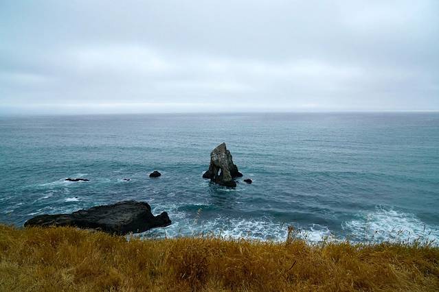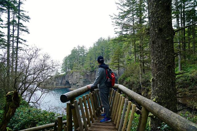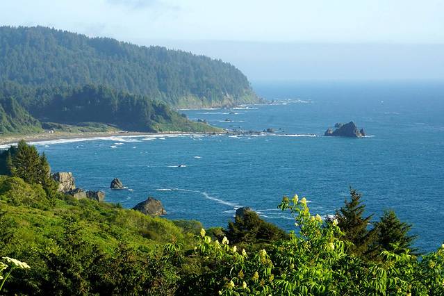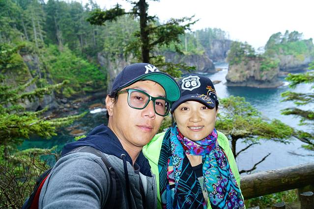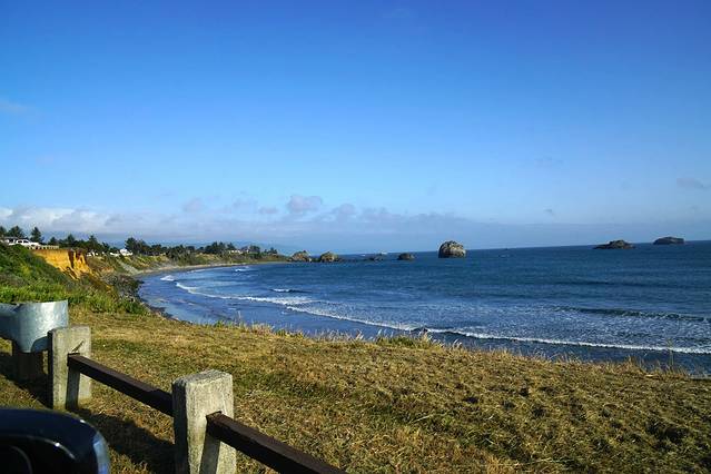 住的地方有着落了,我们连房间都没去,直奔 Klamath Overlook。这是一个可以看到鲸鱼的观景台,在山上。一条步道可以走到海边,我们走了一小段,太多类似毛毛虫的那种虫在地上爬了,而且山很陡,走下去容易上来一定很艰难,就放弃了。在观景台用望远镜看的眼睛都流眼泪了也没找到鲸鱼。