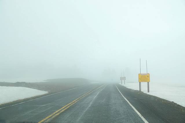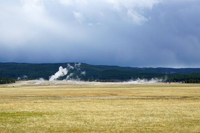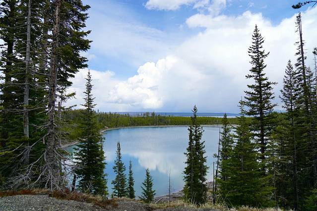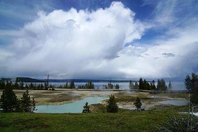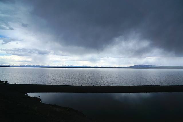 绕着West Thumb的木栈道走完一圈,天就暗了下来,乌云笼罩了Yellowstone Lake,湖水变成了青灰色,车子开出去不多久滂沱的大雨就落了下来,然后演变成了雨加冰雹。我们一方面庆幸刚好走完了West Thumb步道,另一方面也为接下来的游览开始担忧,也许会来得快去的快吧。看看时间已是正午,也不可能下车游览,干脆找了一处能看到湖景的路边停车位停下来,吃了点干粮,睡了个午觉。