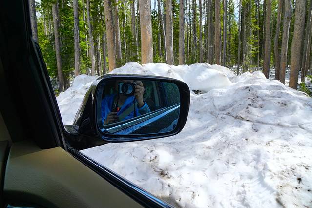 我们在进入公园的时候拿到了一张黄石的地图和一叠报纸,因为报纸是英文的,所以没有看,一直都在看地图,直到发现道路不通,停下来研究路线的时候,才想到去那摞报纸找道路开放的时间表,结果竟然发现一张景区图在两条路上打着大大的“×”。这也就意味着我们必须要调整游览计划了,8的上下两圈都有一段路不通,我们没法按左8右8来游览了,只能按照上8下8来走了。不过,塞翁失马焉知非福,虽然我们因为没事先看好路线走进了封路的路段,多走了一点冤枉路,但冰雪尚未消融的森林很是美丽,不开进去是看不到的。