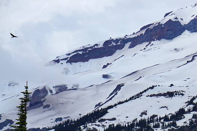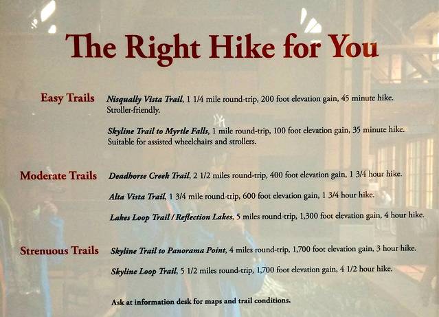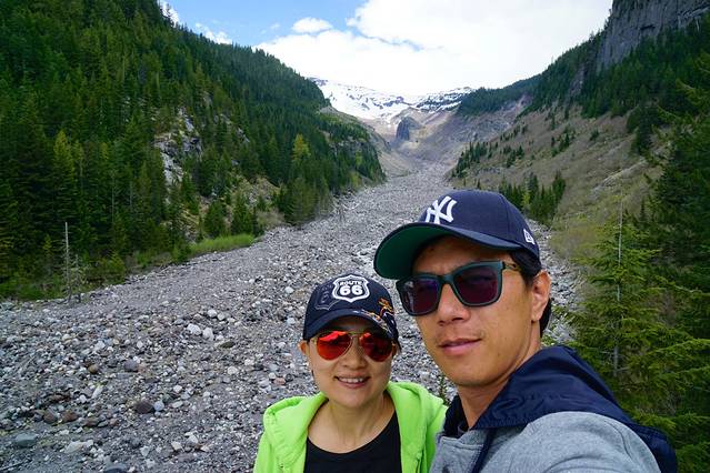 公园里有几个大的观景点,是从不同的角度看瑞尼尔山,除了几个瀑布和小河我们徒了一小段步,其他的景点几乎都不需要走什么路,下车就可以到达观景台。于是,我们打算挑战一段最高难度的Skyline Trail。到达Paradise景区停车场的时候,有很多装备专业的登山者已经在车旁边卸下大背包、脱下雪地靴了,还有其他很多包括登山杖之类的装备放在旁边,而且每个人脸上都挂着疲惫。看到这个场景,我们心里基本有数了,我们最多也就是能走上一小段而已,挑战最高难度不过是开开玩笑而已。