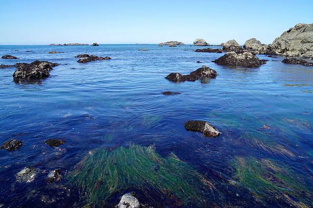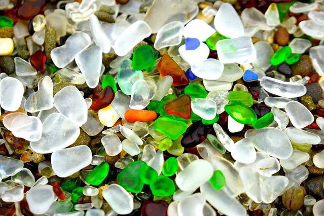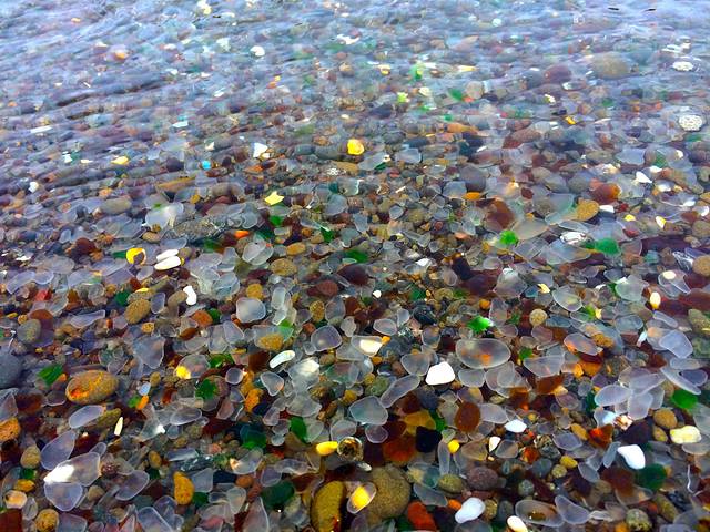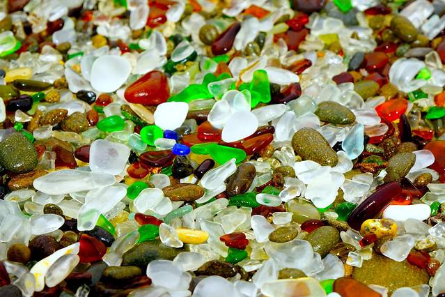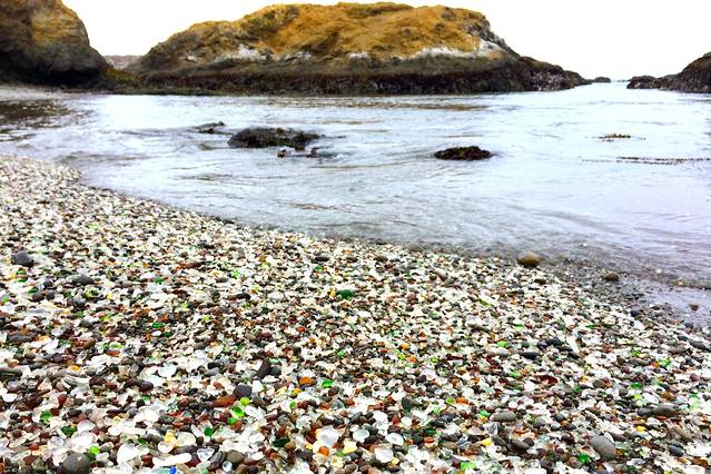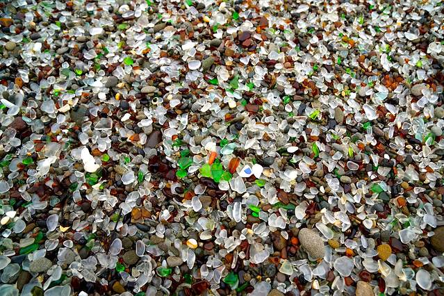 这个玻璃沙滩非常不起眼,按照导航指的位置停好车,沿着海边一路找过去,有一个小牌子指着一片沙滩。但从高处看,并没有五颜六色的玻璃,看起来这个沙滩还有点烂。当走到沙滩,低头一看,还真是有很多椭圆形的玻璃和鹅卵石混在一起,大多数是白色和棕色的,漂亮的蓝色、绿色、红色已经不多了。后来,我们发现很多人拿着塑料口袋在捡漂亮的玻璃,这才明白为何只剩下不那么鲜艳的玻璃了。这个沙滩原本是个垃圾场,后来注重环保了,就把垃圾都清理了,但是散落的玻璃混在石头中留了下来,日积月累被海水冲刷成了这漂亮的玻璃沙滩。大自然的力量真是神奇而伟大,总是把美带给我们,不管我们曾经对它做过什么,它都只是用爱来回报一切。
