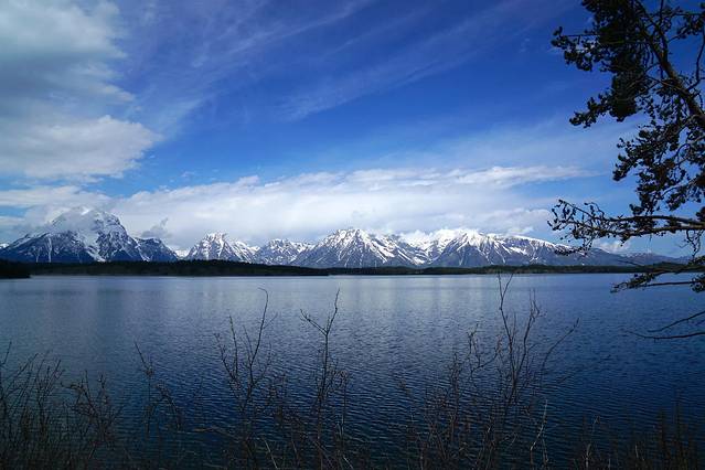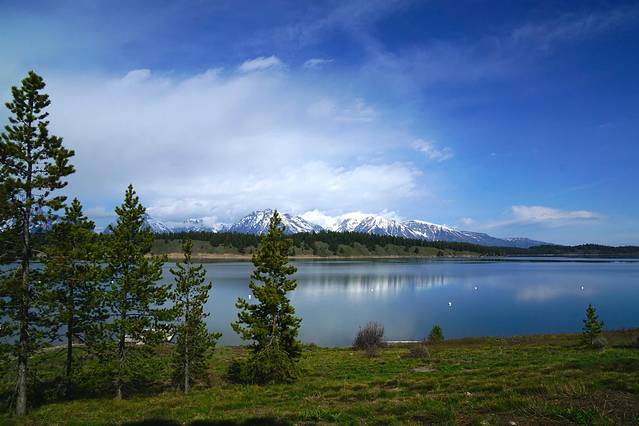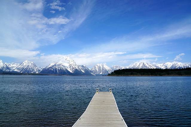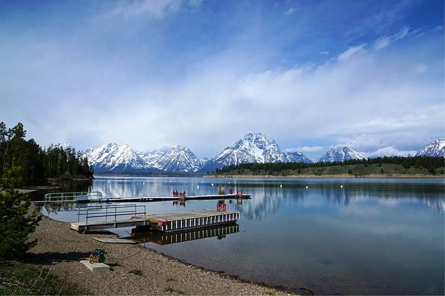 Jackson Lake(杰克逊湖)比Jenny Lake大很多很多,西线有一大半的路都是沿着Janny Lake的,多个观景点可在不同的角度欣赏雪山湖泊的壮丽景色,也有一些湖边的徒步小路和几个船码头。老外蛮喜欢自己拖着船到处去划的,我们经常看到车子顶上架着一条船或者车后拖着一条船。