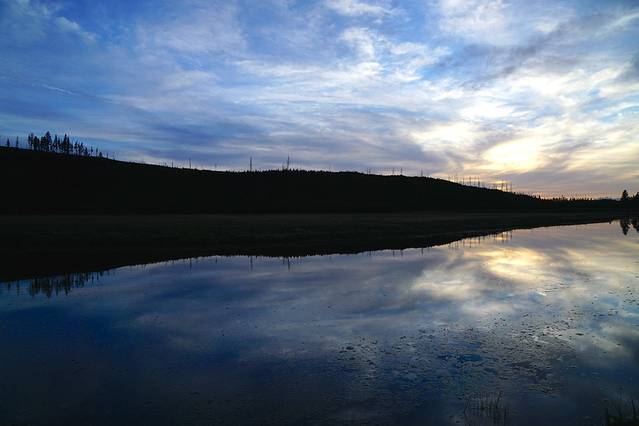 回到西门附近的时候才刚刚5点钟,我们打算去爬山看大棱镜,往返一个多小时天应该还没有黑。可是刚转进通往Fairy Falls Trail的公路,就看到一个封路的牌子,我的理解应该是说熊现在冬眠醒来了,需要在这一带觅食,人类的活动会影响它们,当然也有可能让人类陷入危险,所以现在封闭道路,禁止进入。我们的大棱镜梦又破碎了,既然已经来到了,决定再去看一次大棱镜,看风向有没有变化,会不会把大棱镜上的蒸汽吹去一边,好让我们看到更多的色彩。