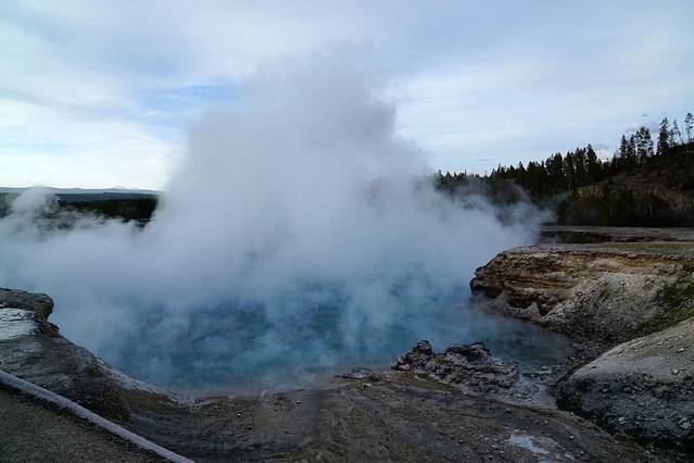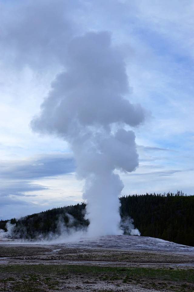老忠实泉在100多年间,每隔33-93分钟就会喷发一次,每次喷发持续四到五分钟,水柱高达40多米。老忠实泉的游客中心有喷发的时刻表,不过我们去到的时候游客中心已经下班了。既来之则安之,我们随便找了一个地方坐下来等,反正走了一天也累了,最多不就是等一个半小时嘛,我们就等着了。结果,非常幸运的,不到10分钟时间,我们面前的一个泉就开始喷发了,水柱非常的高,喷发的时候还有突突的声音。我根本不想拍照,只有几分钟时间,当然是要好好欣赏啦! 所以,下面的照片都是喷完拍的,没有水柱了,只有烟还在不停的冒着。