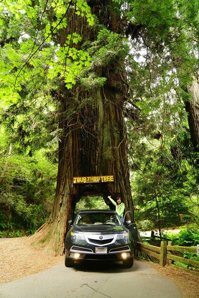 我们首先去了昨天晚上没有进去的Klamath Tour Thru Tree,5美元门票只是钻一下这个树洞,并没有其他的景点。这一带有三个可以钻车的大树洞,都是私人经营的,不属于国家或州立公园,所以要另外买票。经过了解,我们知道这个是最大最漂亮的可以钻车的树洞,而且是我们遇到的第一个这样的树洞,所以就来了这个。进去之后有一条小路,终点处就是这棵大树了,大树旁边有一个回旋处,几台车在排队,钻完还可以重新排队再钻。树洞刚刚够我们的SUV通过,不过要把反光镜折起来,也就是乐哥的驾驶技术了,是我的话肯定过不去,我只是在他的完成作品摆拍了一下。