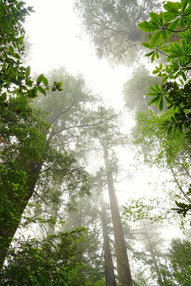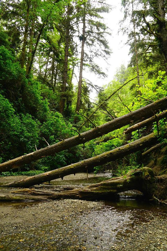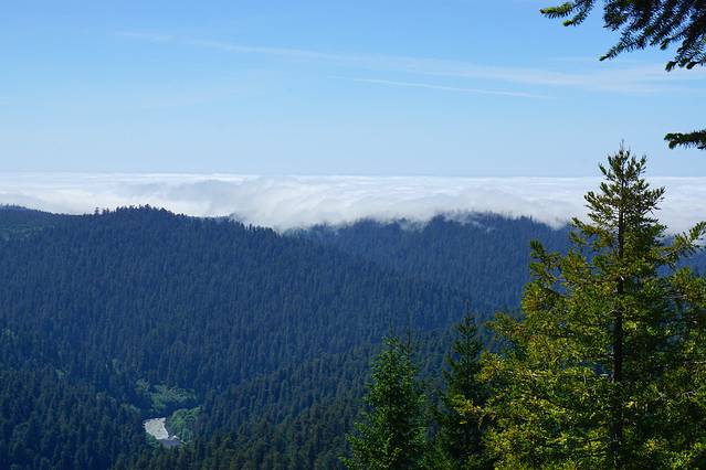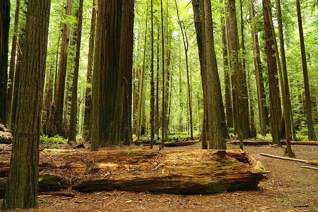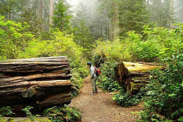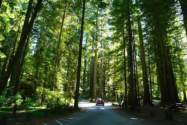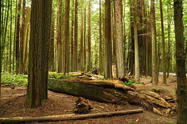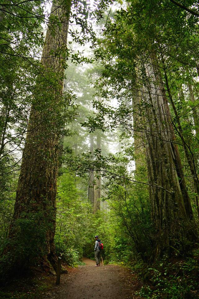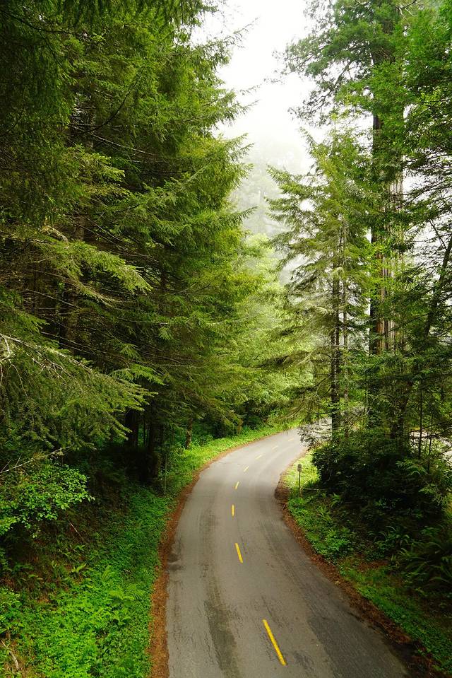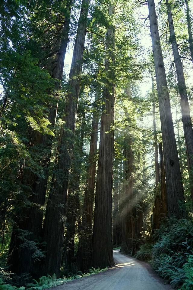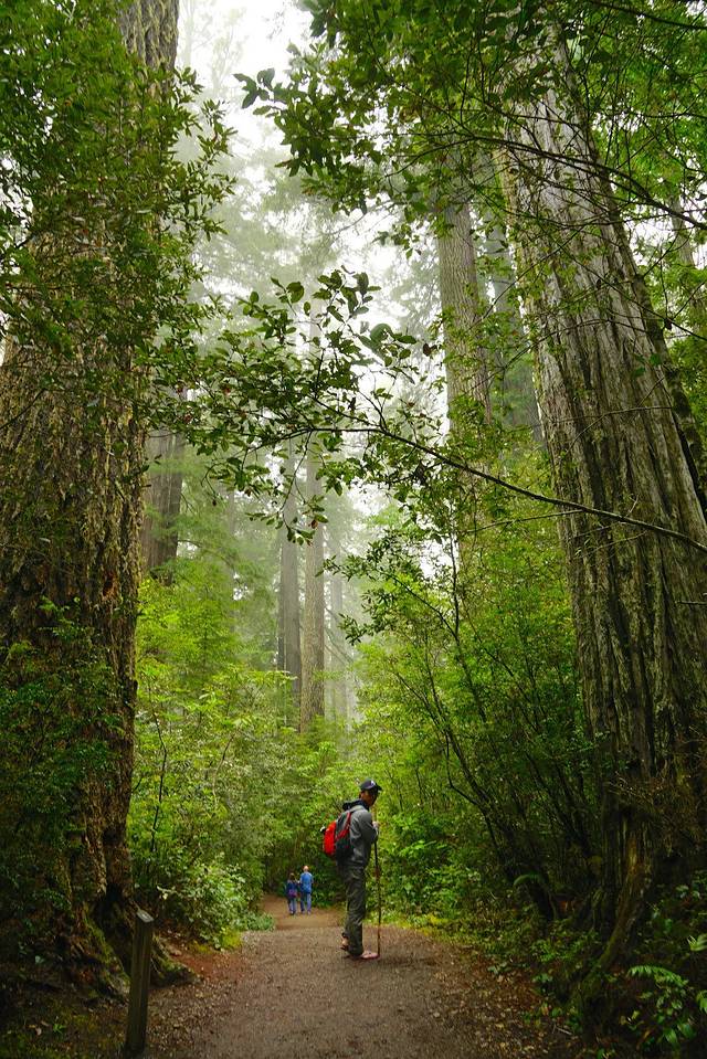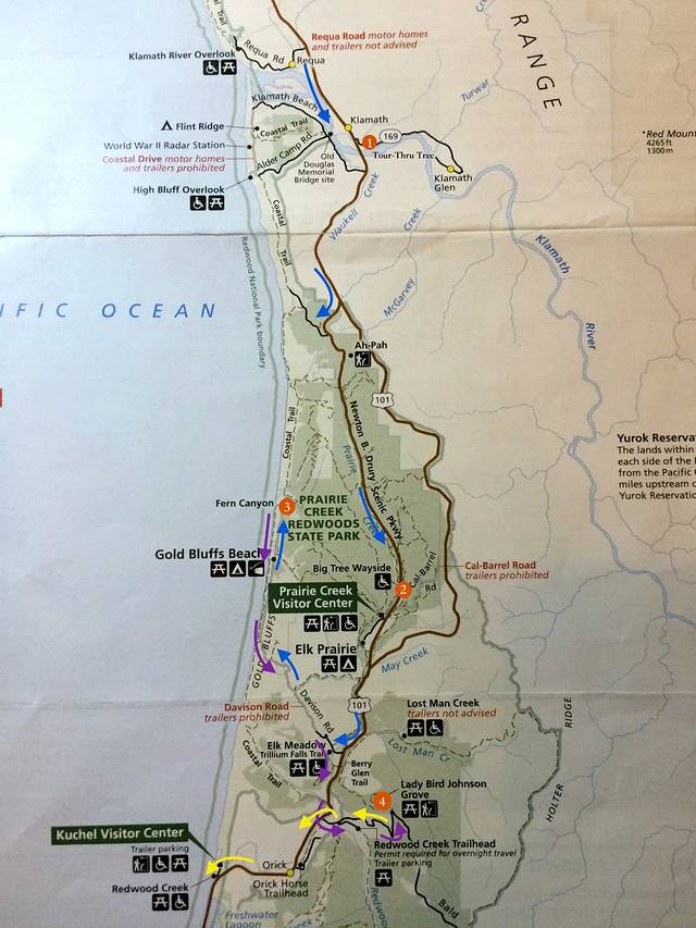 我们迂回的往内陆绕了两天,今天又重新回到了海边,从内陆穿越到海边不知道翻了多少座山,感觉一直都在山里穿行着,直到进入Crescent City(克雷森特城)。从山中钻出来,199公路旁接近Jedediah Smith Redwood State Park有一个旅游信息中心,那里有旅游地图介绍周边的景点,我们发现周围都是红木公园——有两三个州立红木公园、一个国家公园。沿着199公路往101公路这一段,路两旁的大树已然拉开了Redwood红木之旅的序幕。