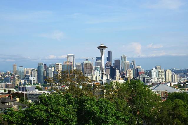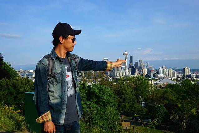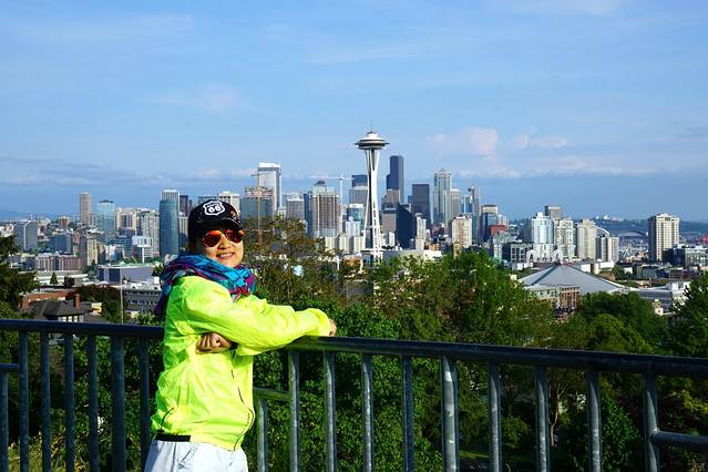 太空针应该算是西雅图的地标建筑了,今天去了两个公园,都是在从不同的角度看太空针。不过,我们还没有热衷到要去爬上太空针,爬上塔顶就看不到它本身了,而从高处俯瞰西雅图,这个塔却不是最高的建筑,所以没有觉得有很大的必要去登塔。KerryPark(克里公园)有一个观景点,可以在山顶俯瞰西雅图,不过树有点太密了,还是太空针够高,可以不被挡住。发现美国的很多观景点都有这个问题,可能当时建观景台的时候前面的树还没那么高、没那么密,长着长着就完全把景挡住了,好多次我们按照指示牌指的观景点停车看风景,都是只看到一片树。其实我觉得这挺好的,既然树长高了,就让它长吧,为什么一定要为了人的视线而砍了它呢!