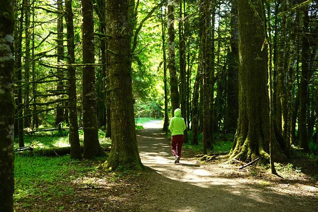 Hoh Rain Forest游客中心附近有几条徒步路线,但游客中心还没有开放,我们找了好几圈,把最短的徒步路线都走完了,才在一个告示栏里看到了周围徒步路线的介绍,选择了一条中等难度的环线,体验温带雨林的魅力。这条徒步小路环线走下来两三公里,非常轻松,路两旁的景致相当丰富,尽管走了两天森林小路,在这里依旧不会觉得厌倦,依旧充满了新奇感。