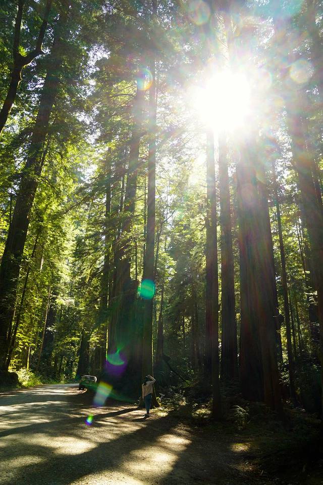 游客中心一行果然很有收获啊,这个地方真的太棒了!工作人员告诉我们的园内小路几乎横穿了整个公园,一直通到101公路。这段路全是土路,两旁全是红杉森林,就是一条车车的森林”徒步“路线啊,太棒了!我们在这条Trail走的时候,发现有一个岔路是往我们刚才徒步的那个方向去的,而且真的非常容易走错,因为我们这条Trail是需要爬上一个倒在地上的树干走过去的,而那条Trail看起来更像一条正式的路,但完全是两个方向。我们这才反应过来,刚才那两个人一定是从这个停车场出发的,结果在这里走错了方向,而他们问我们停车场,那边正好也有一个停车场,我们并不知道这里也有一个停车场,真是晕啊!看来在美国的森林徒步,还是要掌握好路线的长度,看清标识,认准方向啊。还好,我们家乐哥方向感还不错,每次都把我引上正道,没他在旁边我真的迷路N次了,刚才那个岔路我就不相信正确的路是要去爬树的,是他分析了地形和指示牌,我才半信半疑的跟着他走的。