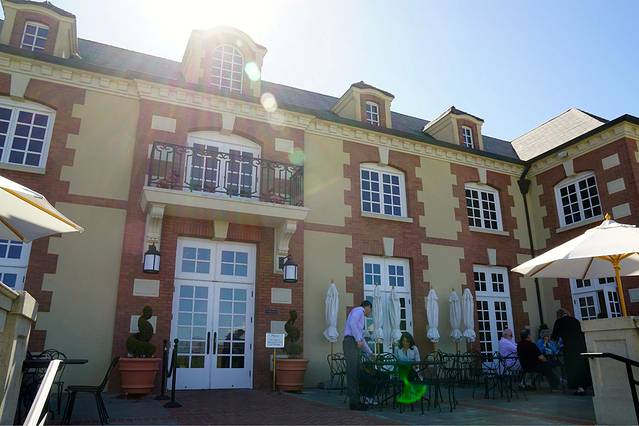 Domaine Chandon 酒庄是在路边看到的,一看那么气派、那么多车,就决定开进去看看。打开搜集好的纳帕酒庄资料一看,Domaine Chandon 酒庄不一般啊!说是Napa地区规模最大名气最大的酒庄,也是第一家拥有法国血统的酒庄,隶属于世界奢侈品集团LVMH旗下。因为第一次去酒庄,完全摸不到门道,就只是参观了一下外面,没有品酒和用餐,也没进去内部参观,毕竟这里只是路过,Castellodi Amorosa酒庄才是我们的目的地。不过看到很多人喝着香槟吃着漂亮的点心,还是蛮惬意的——这个酒庄盛产香槟。
