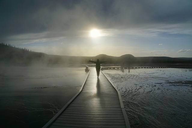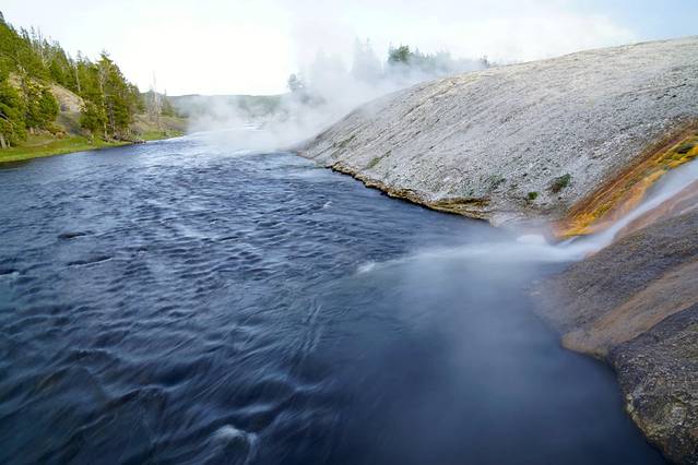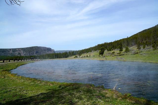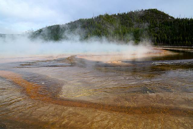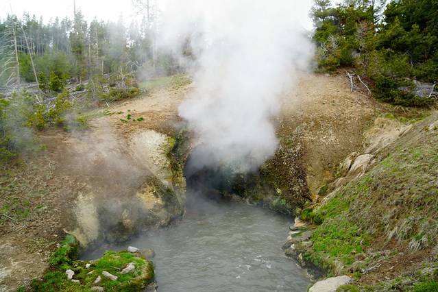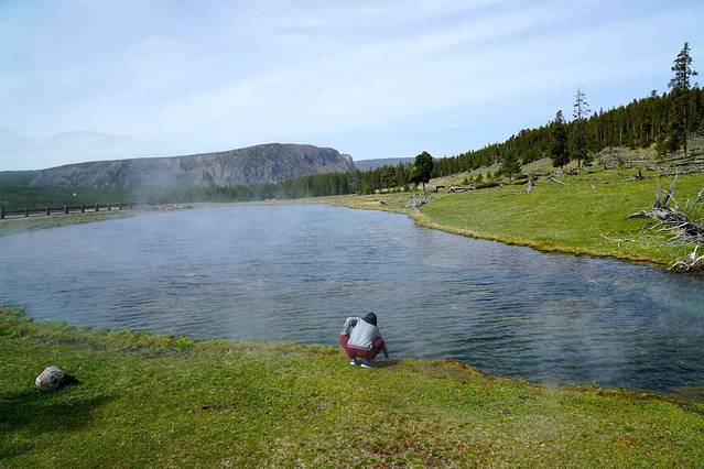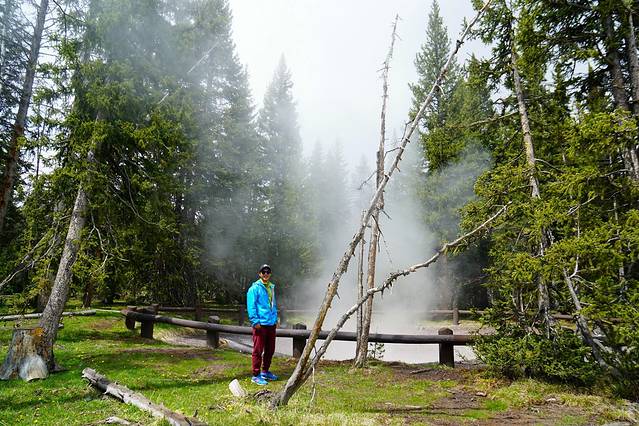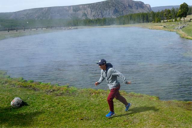 黄石到处都是冒着烟的热泉,路边的小河汩汩的冒出热水,湖面泛着青烟,穿行其间,有点在仙境腾云驾雾的感觉。乐哥跑下去一个湖边摸了一下湖水,水很热,大约有五六十度,这是一个冒烟很少的湖,那些冒着浓浓白烟的热泉可不敢乱摸,当然,一般情况那些热泉都会拦起来不让靠太近的。