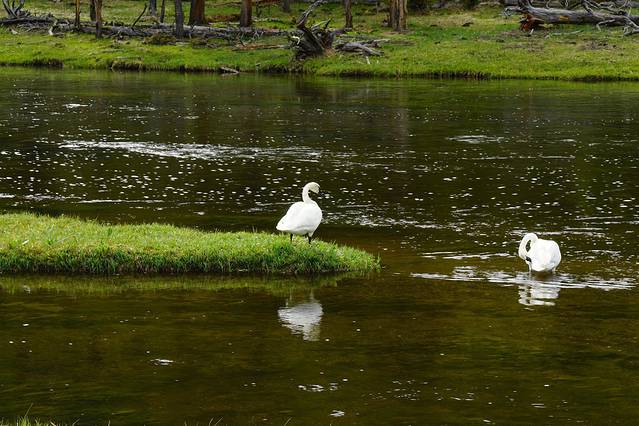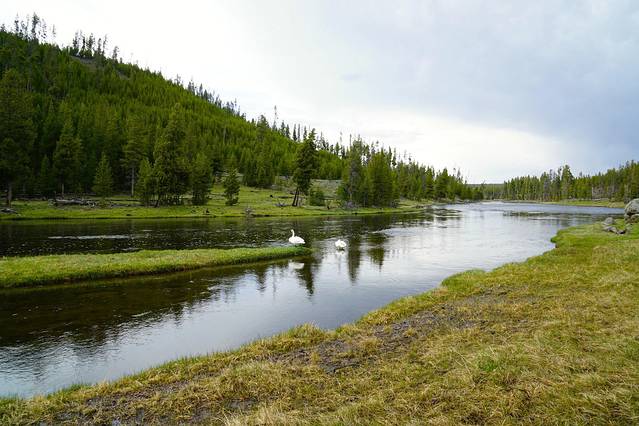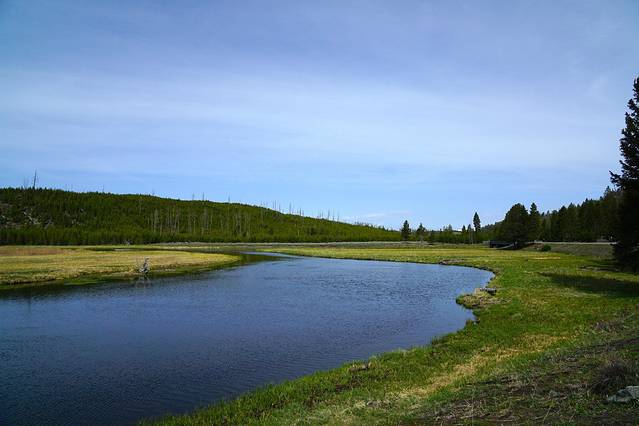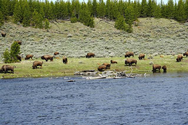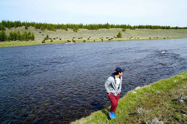 昨天的行程以野牛结束,今天的行程从野牛开始。今天是去8的上面一个圈,到达第一个景点Norris景区要走46公里的回头路,别无选择,不能住在景区里面,通常都是需要这样奔波的。我们尽量选择一些小岔路,能感受一些不同的景色,于是,在河边的一条小路,我们又一次遇到了野牛,它们起的很早啊,在用早餐吧!Good Morning!