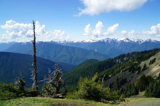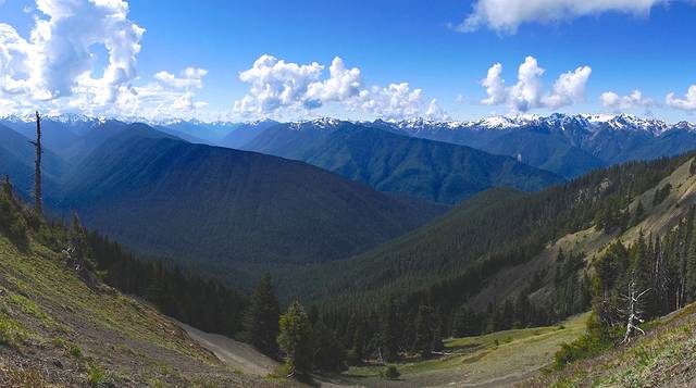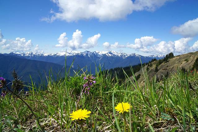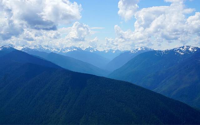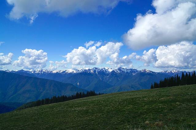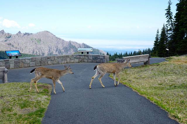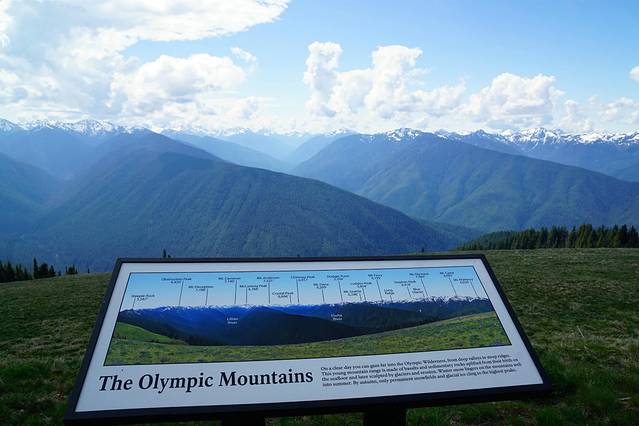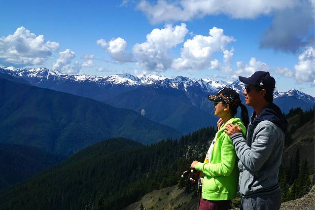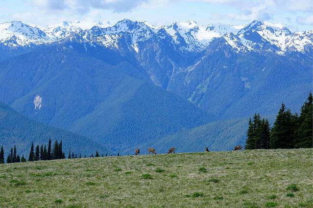 Olympic National Park(奥林匹克国家公园)的面积非常大(3600多平方公里),几乎占据了整个奥林匹克半岛,而景点却很分散。公园的主路就是环绕公园一圈的101公路,每个景点都是从101延伸出去的小路,游览任何一个景点都需要原路返回到101上,这样一进一出至少有几十公里,有的还要上百公里。我们今天很早起来很晚入住也只是走了Port Angeles到Forks这一段的3个点:Hurricane Ridge(暴风山脊) 、Lake Crescent(新月湖)和Cape Flattery(夫拉特黎角)。