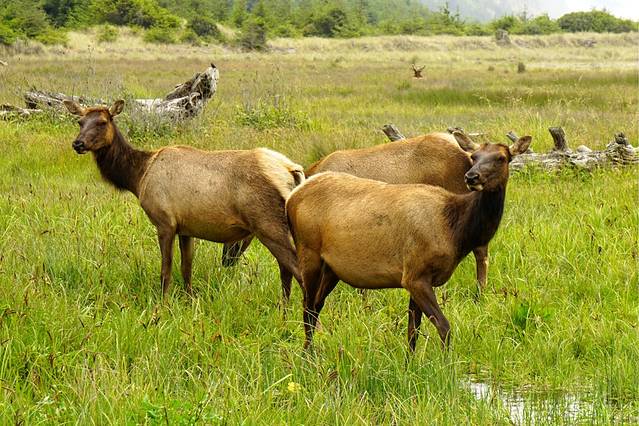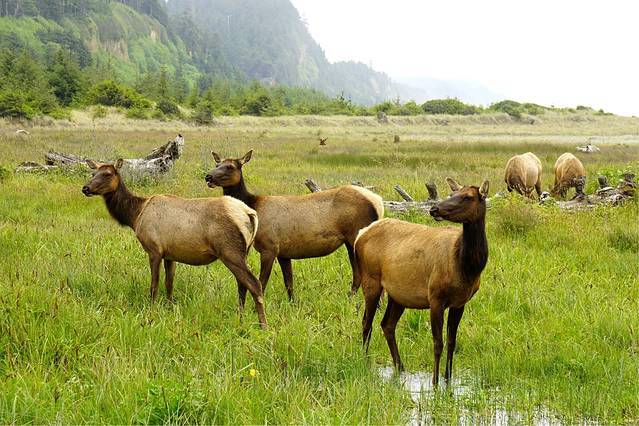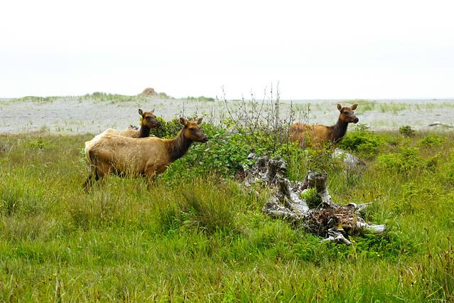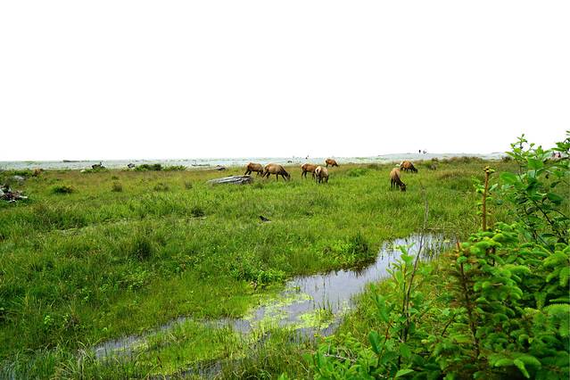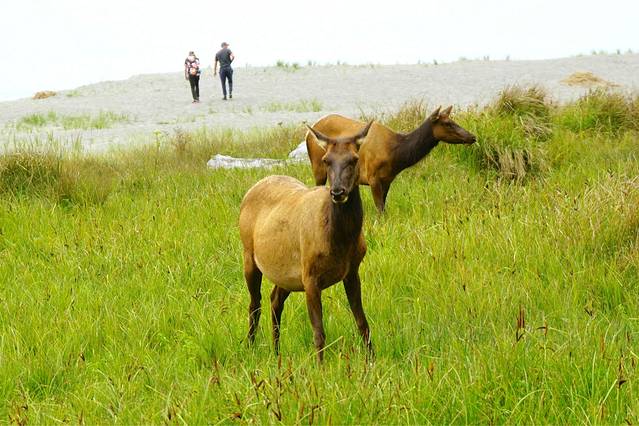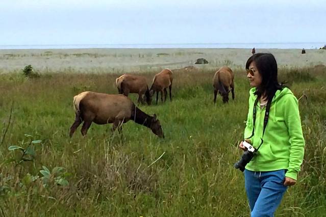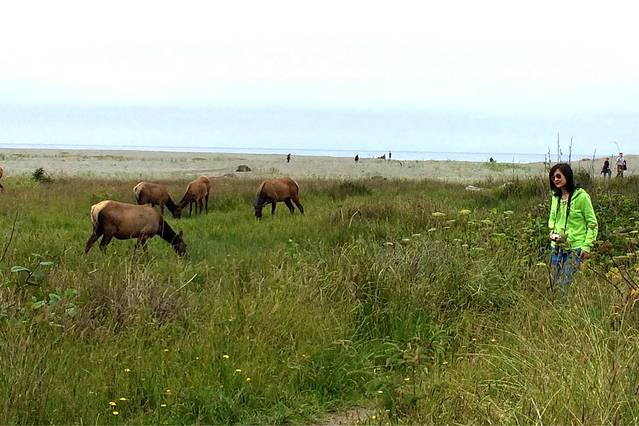 我们回到停车场看到很多人往Gold Bluffs Beach方向去,就又跟着人群去了,原来这里有很多麋鹿。这些鹿的角还没有生出来,当时乐哥问我是什么动物,我觉得什么都像又什么都不像,就随口说“四不像”。后来看了介绍知道是麋鹿,再上网一搜,原来麋鹿就是俗称的“四不像”,因为它的头脸像马、角像鹿、颈像骆驼、尾像驴,我这还是歪打正着了。