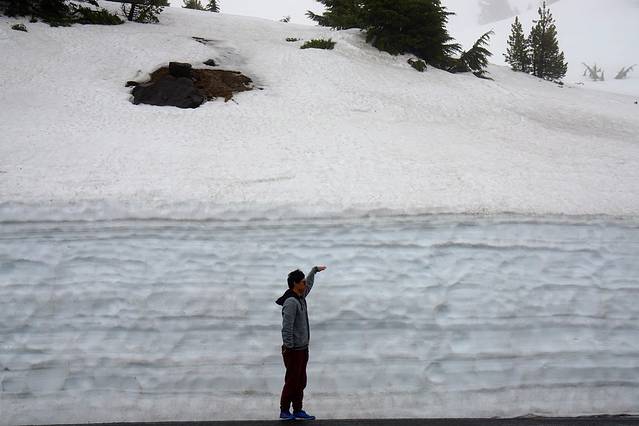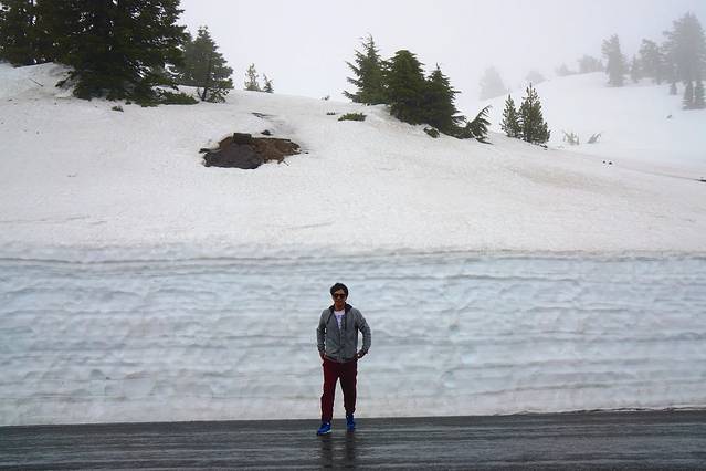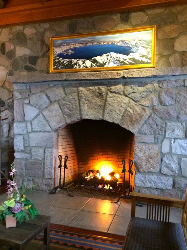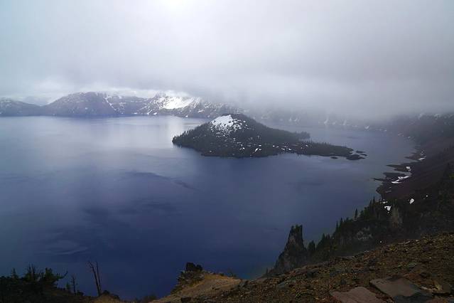 在Rim Vilage不仅有游客中心,还有一家高级酒店和一个观景台。到达那里的时候雨大的穿着雨衣下车都觉得会渗进去。因为没有看到湖,而这个湖和这个公园又这么美,站在阳光下的雪地上,是多么美好的事情。所以,我很想能在这里住一天,明天再游。我们冒着大雨冲进酒店,希望有奇迹发生,毕竟美国的国家公园里面的酒店是提前好几个月就被抢订一空的。我们一进大门,一位穿着欧洲古典风格制服的大叔极其绅士的为我们开门,然后问我们有什么需要。我问他还有没有空房,他遗憾的摇了摇头,说早就预定满了。于是,我们说借个洗手间,他礼貌的指引了方向。乐哥去洗手间的时候,我落寞的对着壁炉发呆,就这样结束火山湖公园之行,真的很不甘心,但又能怎样呢?园区的酒店已经满了,周边的小镇开车进来要一百多公里,而且是山路,起码要2-3小时,进出一次就是五六个小时,出去住了再进来的可能性不大。这时,刚才那位非常绅士的大叔走到我旁边,小声的告诉我,在门口附近有一家Motel,只有十几英里远,我可以去那里试试看。我谢过他,充满希望的去寻找他说的那家小酒店,因为只是听到他的发音,我拼不出名字,但如果见到名字能大概知道是他的那个发音,事实上,只要能有Motel,是不是他说的也并不重要。但后来,我们并没有找到任何酒店,门口有一家酒店,也是公园的酒店,不用问也知道没有空房的。出了景区,开了几十公里都没有见到一家酒店。这个方向的门口出去有好几条岔路,我想,也许我们走的这条路恰巧不是有酒店的那条路。算了,天意如此,何须执着,就此放手,调整心情,继续前行。有多少次当我们还在为先前的遗憾懊恼的时候,就发现后面到来的竟然是更美好的,人生也好、旅游也罢,我坚信一切都是最好的安排。