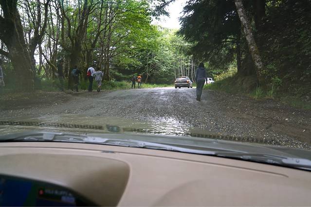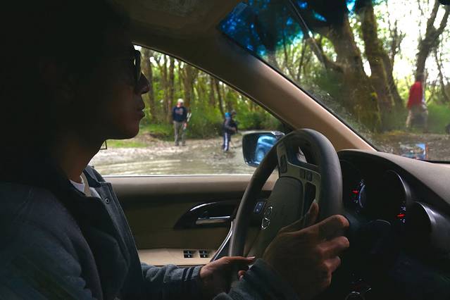 来到火山湖附近天就开始阴起来了,再后来蒙蒙细雨飘落下来,看到小雨丝我们还在幻想也许一会儿太阳升上来、温度高了雨会停的,没想到这雨不仅没有停的迹象,还越来越大了。我们原本的计划是顺时针游湖,从南出口出,这样走的重复的路最少。沿着湖边刚开了一会儿,前面的路就几乎看不到了,雾非常大,能见度大概不到10米。我们思量了一下,这样的天气,环湖的意义真的不大,而且危险,也许直接往南门方向开,顺路游一下沿途的点才是比较明智的。